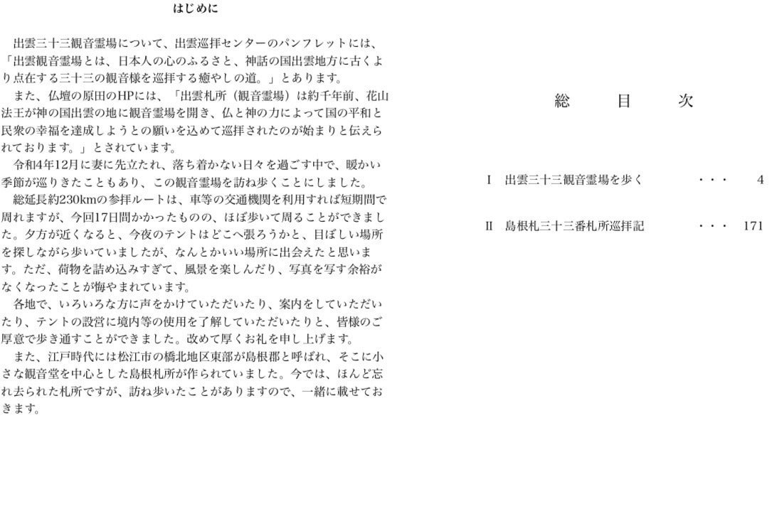 出雲三十三観音霊場を歩き通すにあたっては、沿線の皆様のたくさんのご声援をいただきました。暑い日射しの下を、重い荷物を背負って歩く年寄りの姿を見かねて、「大丈夫ですか。」、「送りましょうか。」と声をかけていただいた方々、また境内にテント設営の許可いただいた寺社の皆様には、本当にお世話になりました。そんなたくさんの応援に対し、是非ともお礼の言葉を本として記録に残したいと、紀行文を自費出版することとし、プロジェクトを立ち上げました。