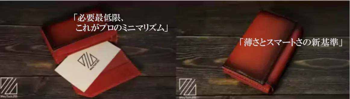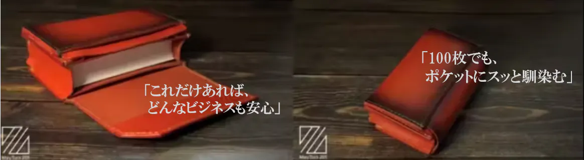 「可変性」、名刺が少ない時はコンパクトに、多い時にも安心して、これ一つで持ち歩くことで、スマートなビジネスマンを印象付けます。
