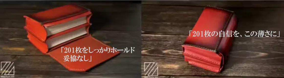 (多くの場合は、例えば50枚入る名刺入れだと、数枚しか入れていない場合にはスカスカになってしまいます。しかし、本商品は最大201枚入る名刺入れですが、例え1枚しか収納しない場合でもしっかりと収納することができる「大きさが変わる名刺入れ」です。)