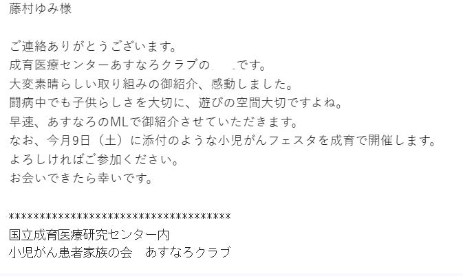 追伸:メールでご招待された「小児がんフェスタ」に参加します。