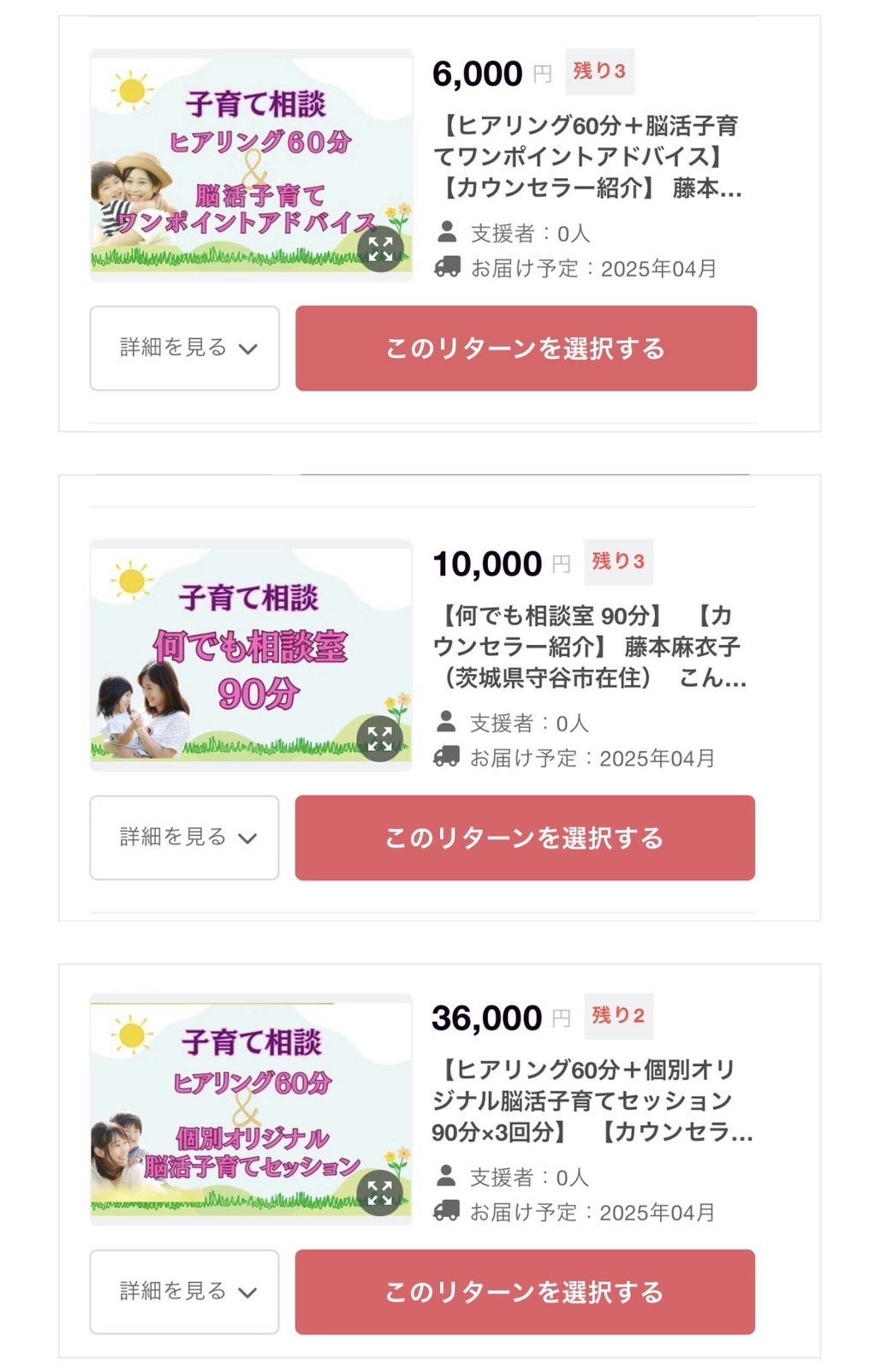 毎日たくさんの応援、ご支援本当にありがとうございます!クラファン起案者の藤村ゆみです。今日は 脳活子育て提唱者&看護師・藤本まいこさん からの提供リターンをご紹介します!子育て中のママにぴったり!脳科学&心理学をベースとした科学的根拠をもとに、必ずスクスク育つコツをお伝えします。「子どもとどう接すればいいんだろう?」「子どもの問題、解決するの?」「もっと子どもの力を伸ばしてあげたい!」そんなお悩みをサポートする 3種類のリターン をご用意しました☆ご自身はもちろん、お友達やご家族にもぜひシェアしてください!みなさんの応援が力になります!!どうぞよろしくお願いいたします。