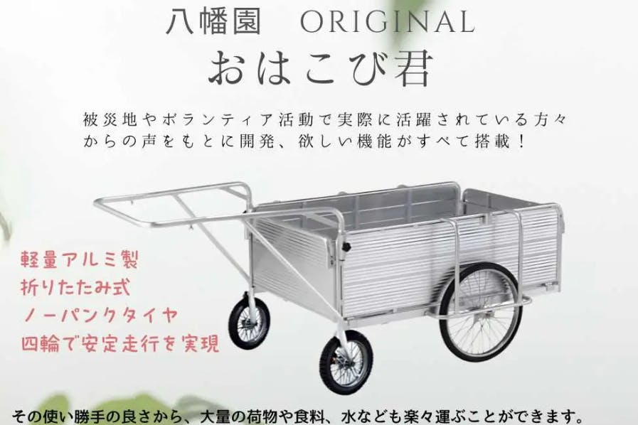 一般社団法人八幡園の代表、八幡と申します。災害集団避難、災害復興、農業でも漁業でも学校でも、地域イベントでも天候に関係なく汎用に使える八幡園が独自に発想した汎用運搬車フリーキャリーの初号機を作成・販売したいと考えています。期間は約半年です。特徴は軽量アルミ製、折り畳み式、ノーパンクタイヤ装備、いつでも水平四輪で安定走行が可能です。そのための資金費用を集めたいです。
