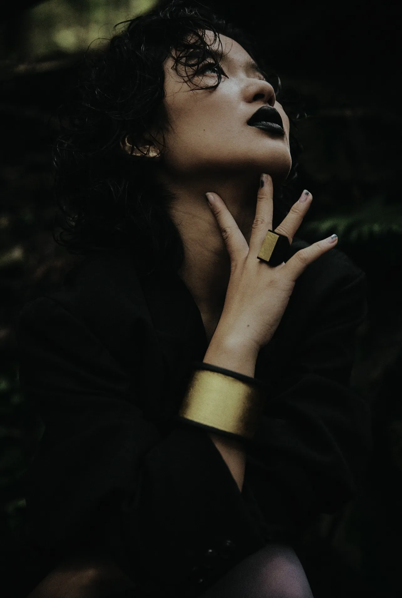 ↑Gold Cube:Sumi LineBallと同様、石目塗という能登の技法を使っており、マットな質の指輪です。フォーマルからカジュアルなファッションにも相性が良く、幅広いジャンルでコーディネート可能です。