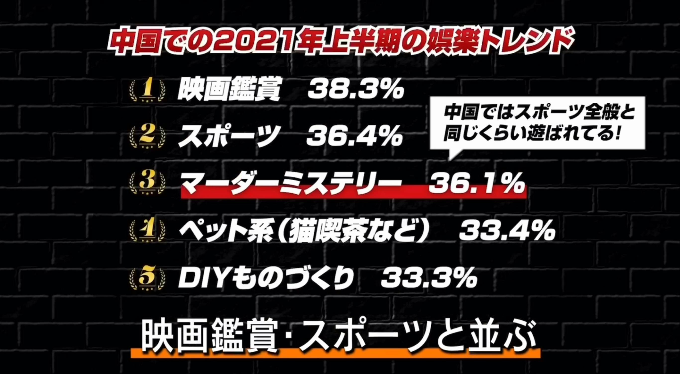 中国では、マーダーミステリーは映画鑑賞やスポーツと並び、休日のエンタメランキングでトップ3に入るほどの人気を誇っており、店舗数もわずか3年で17倍に増加しています。