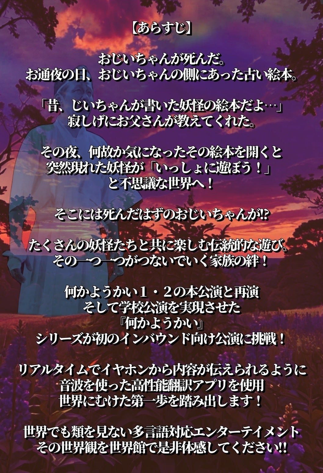 世界から注目を集めている日本の伝統文化の一つでもある妖怪、趣のある日本の昔の遊び、ハイレベルパフォーマンス、国境を越えても親しみやすい家族のストーリーをつめこんで作ったエンターテイメント。