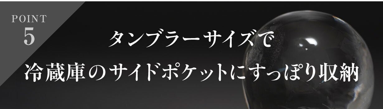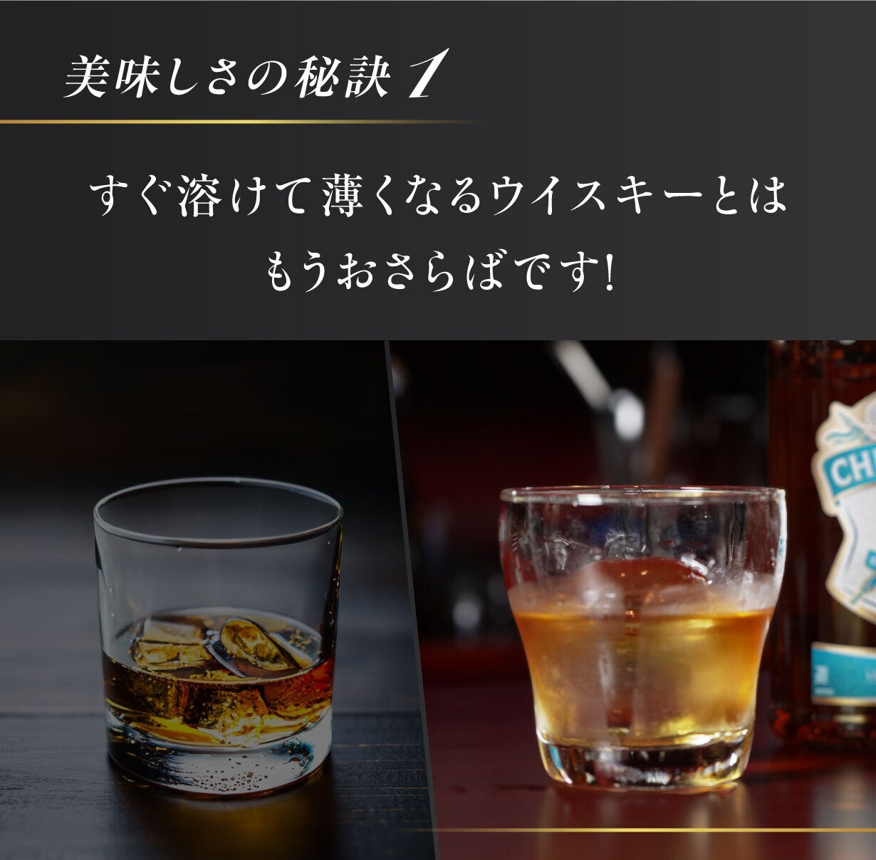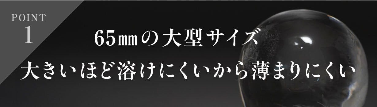 65mmの大型クリスタルアイスは一般的な6cmサイズに比べ、溶けにくく飲み物が薄まりにくいのが特長です。体積に対する表面積の比率が小さいため、長時間冷却効果を持続し、最後の一口まで美味しさをキープします。