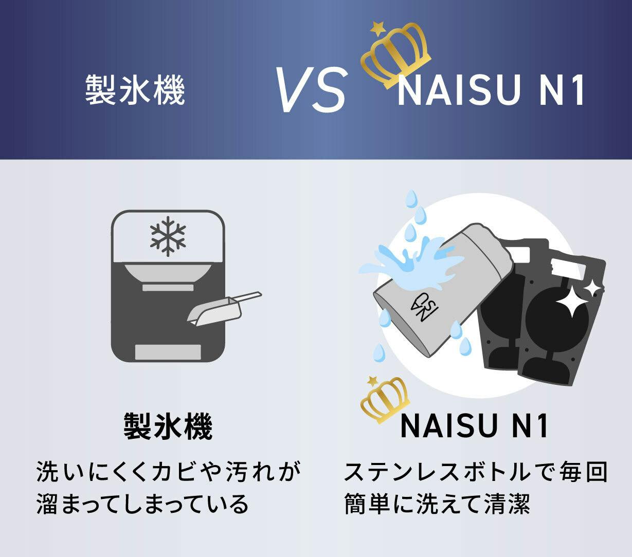 さらに、コンパクトなサイズにもかかわらず、NAISU N1 はほとんどの競合製品と比較して大きな丸氷 (6.5cm) を提供し、飲み物を十分に冷却します。