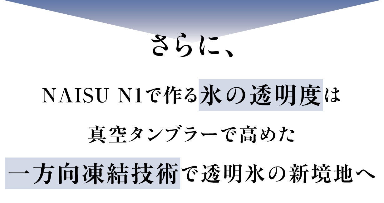 NAISU N1 は、綿密な設計と厳格な試験を経て開発されています。当社の最先端の結晶シーディング技術(一方向凍結技術)により、記録的な速さで非常に透明な氷を作ることができます。