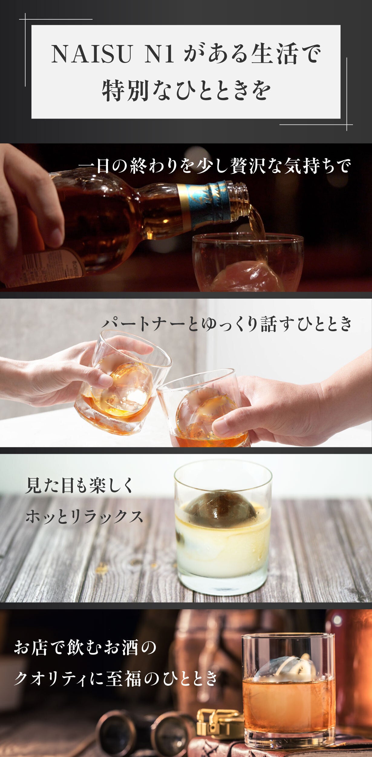 NAISU N1 は、アイスコーヒー、紅茶、ソーダなどのノンアルコール飲料を含むあらゆる飲料用の透明な丸氷を作るのに最適です。