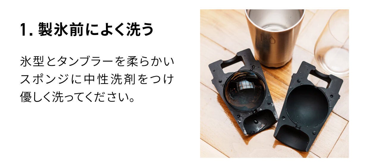 もし使用してしまった場合は、シリコン型を水に完全に浸して1~2分間沸騰させ、残留物を取り除くと、その後の氷は透明になります。