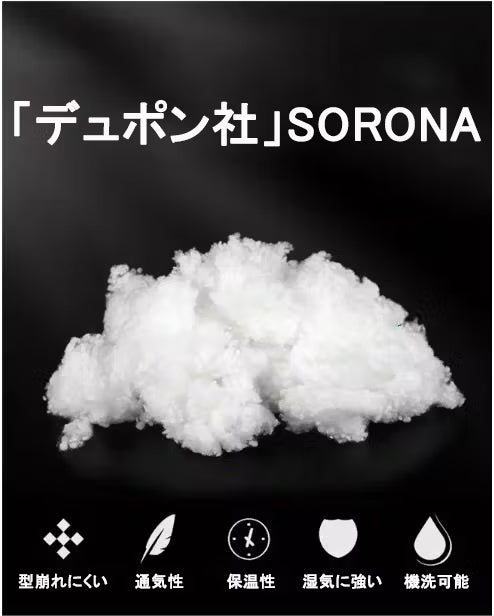 アメリカ発、世界トップ化学メーカー「デュポン社」開発したSORONA高機能中綿はダウンすらも凌駕する抜群の保温性を備え、ダウンと違い湿気等に強いため、厳しい環境に強い中綿です。