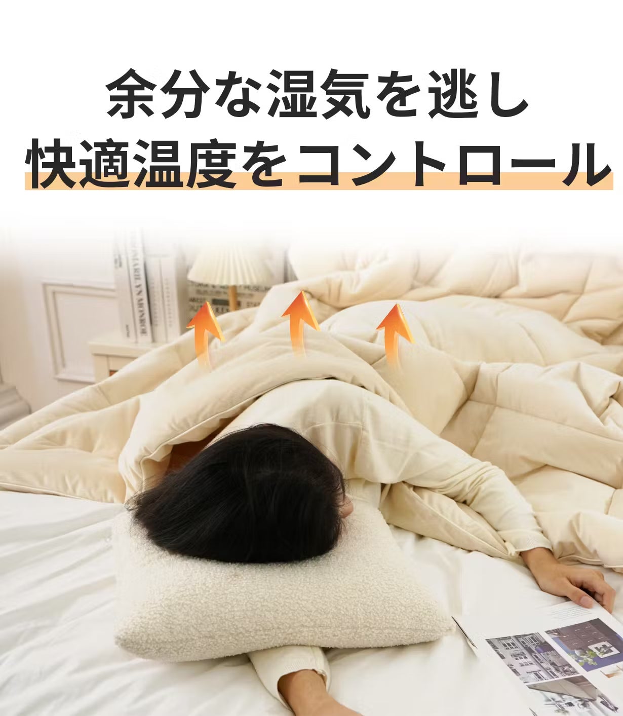暖かいのにムレない快適な寝心地。掛け布団全体で湿気を吸い、ムレない寝床内環境を実現。暖かいだけではなく、しっかりと湿気を放出します。