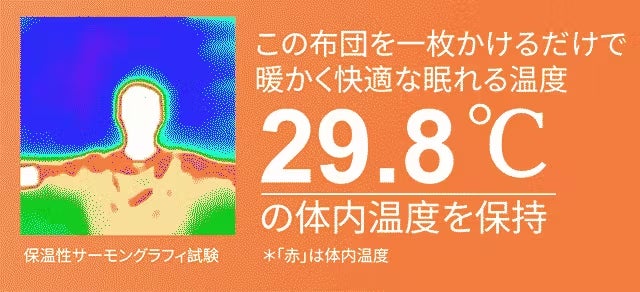 POWEROYは1枚かけるだけでマイナス10℃の環境下でも、人が暖かく、快適に眠れる温度29.8℃の表面温度を保持することができ、布団の中は快適な温度に保たれました。