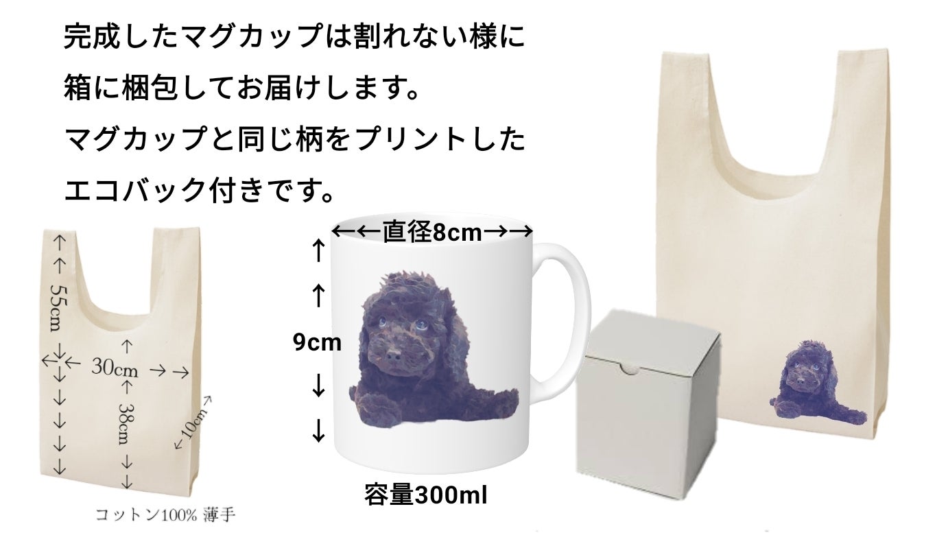 マグカップとお揃い柄をプリントしたエコバック(全体高55cmx幅30cm xマチ10cm 袋高38cm コットン100%薄手)付きです。