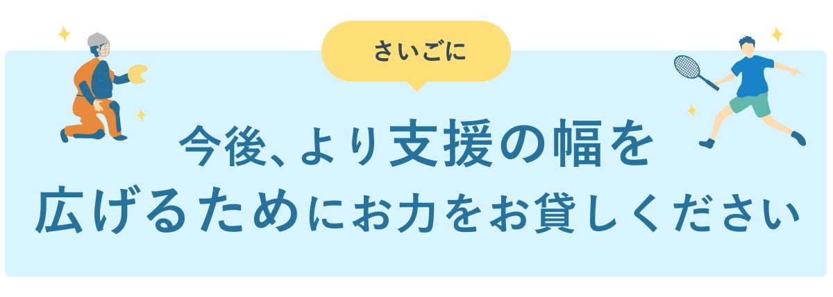 現在日本にスポーツ奨学金制度は数あれど、その全てが優秀なスポーツ選手を育成するためのもの。実は『金銭的に余裕のない子供たちのスポーツ活動を支援するための奨学金財団』は私たちしか存在しません。つまり、私たちが今後どこまで活動の幅を広げることができるかが、一人でも多くの子供たちを救うことに直結するのです。
