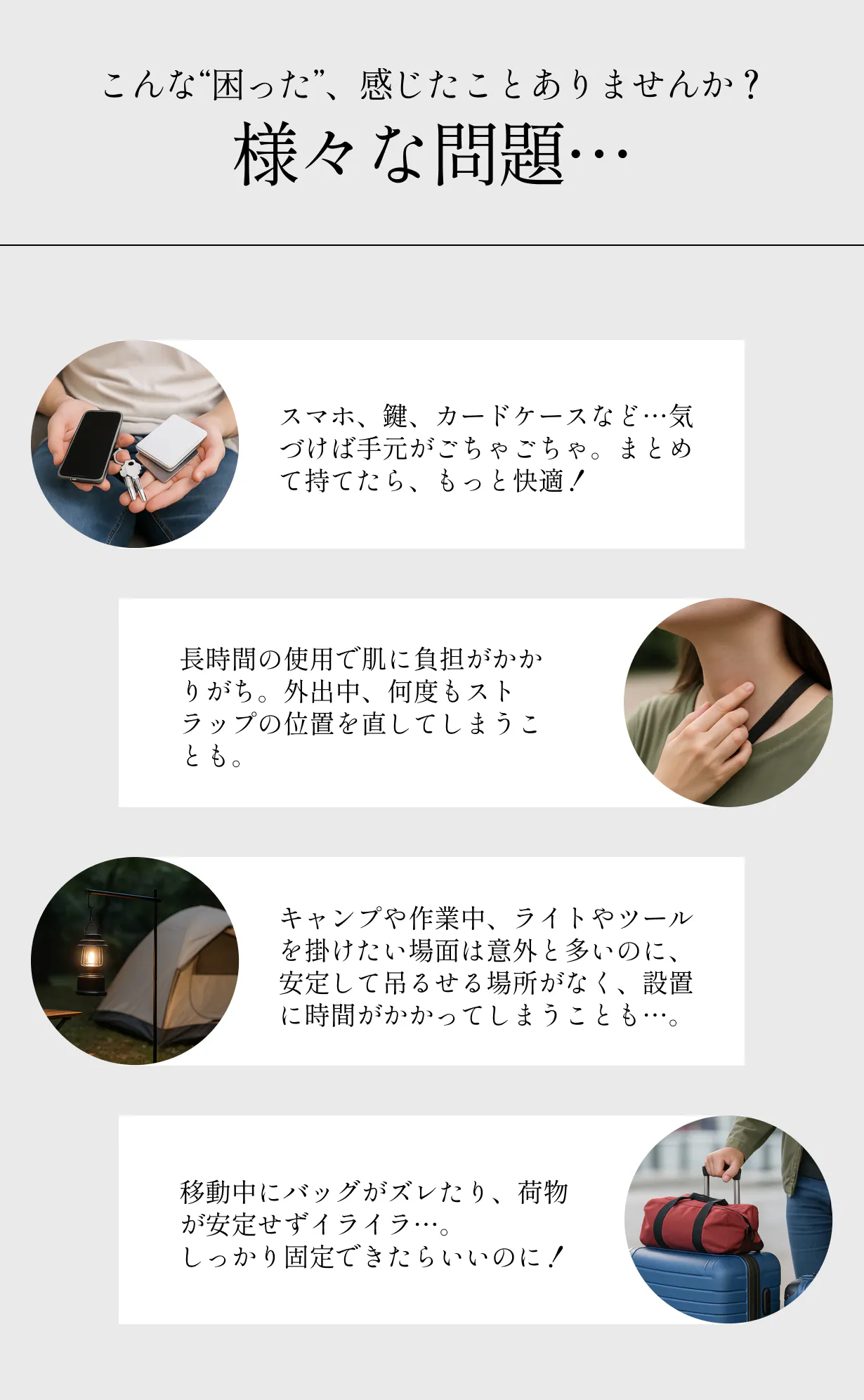 市場にあふれる一般的なストラップも確かに便利ですが、「もっと自分の使いやすいように自由にアレンジできるものが欲しい!」というお客様の声に応えたいと考えました。