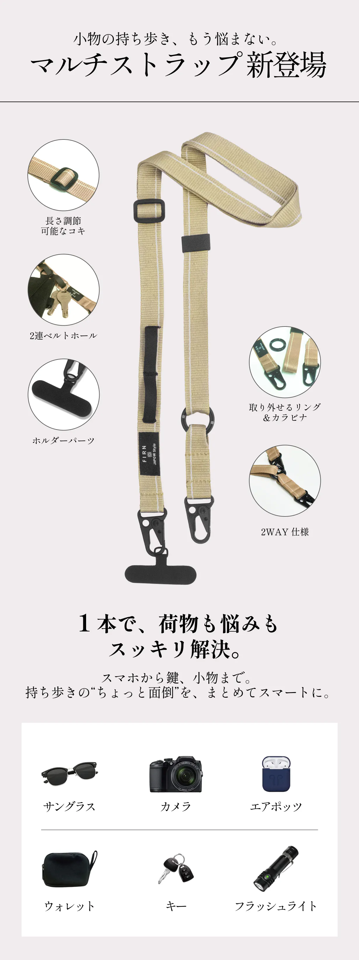 手ぶらでのお出かけやアウトドアなど、さまざまなシーンで活躍するストラップ。Firnの製品は多彩なギミックを搭載し、自由度の高いライフスタイルをサポートします。