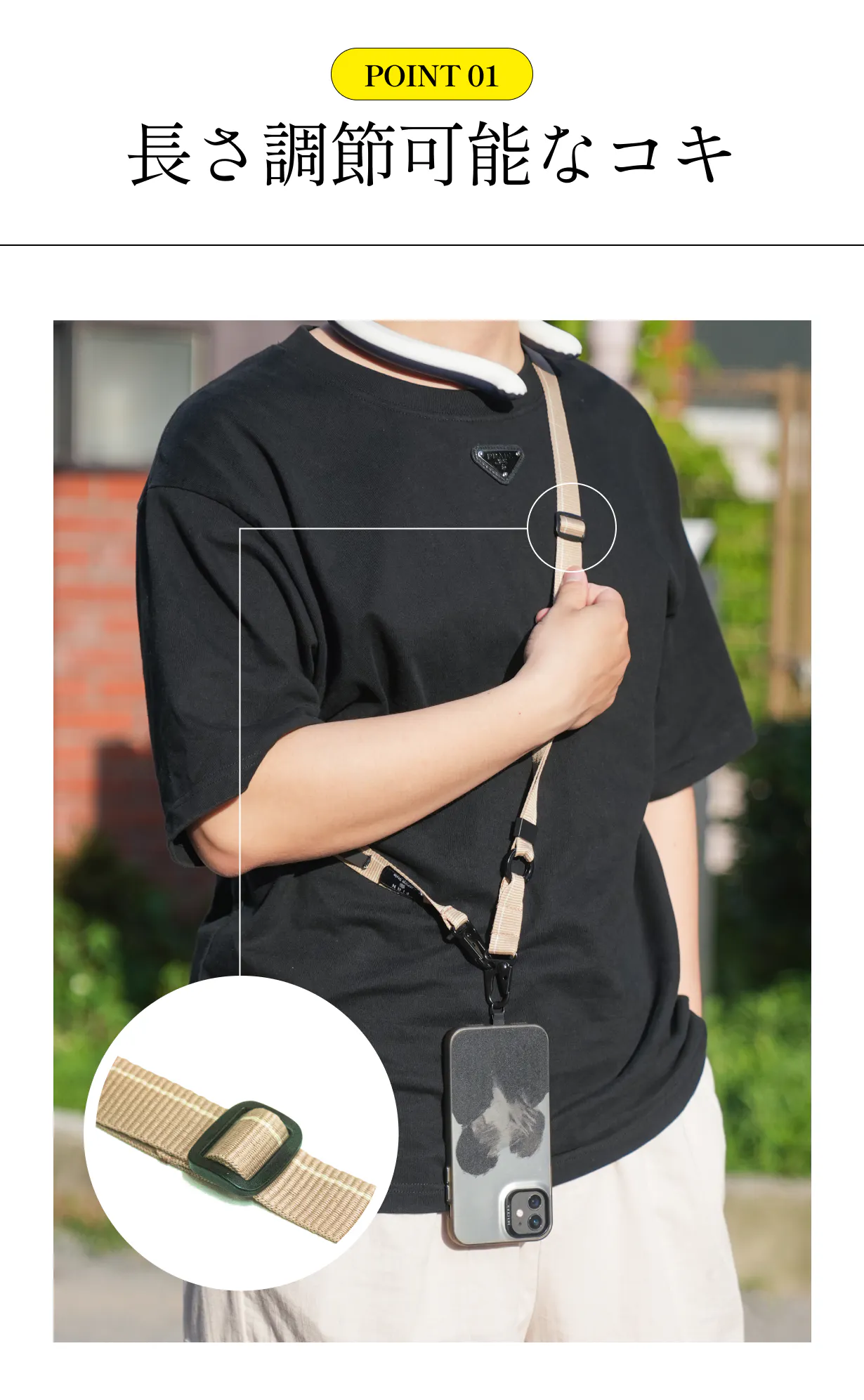 ハンズフリーで、もっと身軽に。長さは最長138cmまで調節OK。