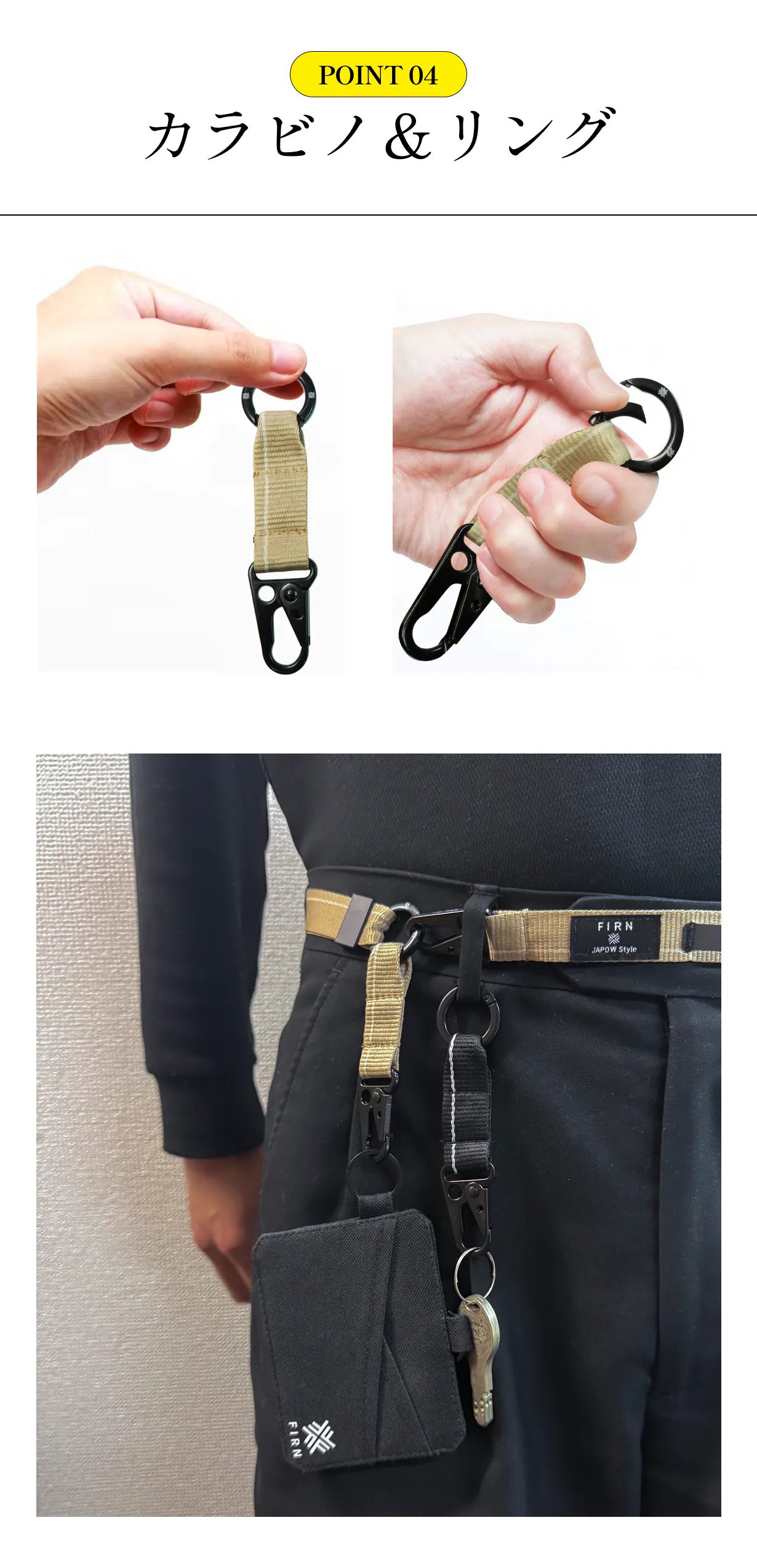 着脱可能なカラビナパーツ、バッグやベルトループなど好きな場所に簡単に取り付け可能。持ち物や使い方に応じて、自由にカスタマイズできます。