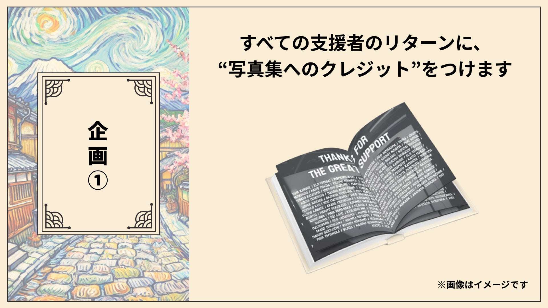 今回のプロジェクトでは、企画①として支援していただいたすべての方のクレジットを写真集の末尾に掲載させていただきます。(クレジットに記載するのは本名でなくても問題ございません。記載しないという選択も可能です。)