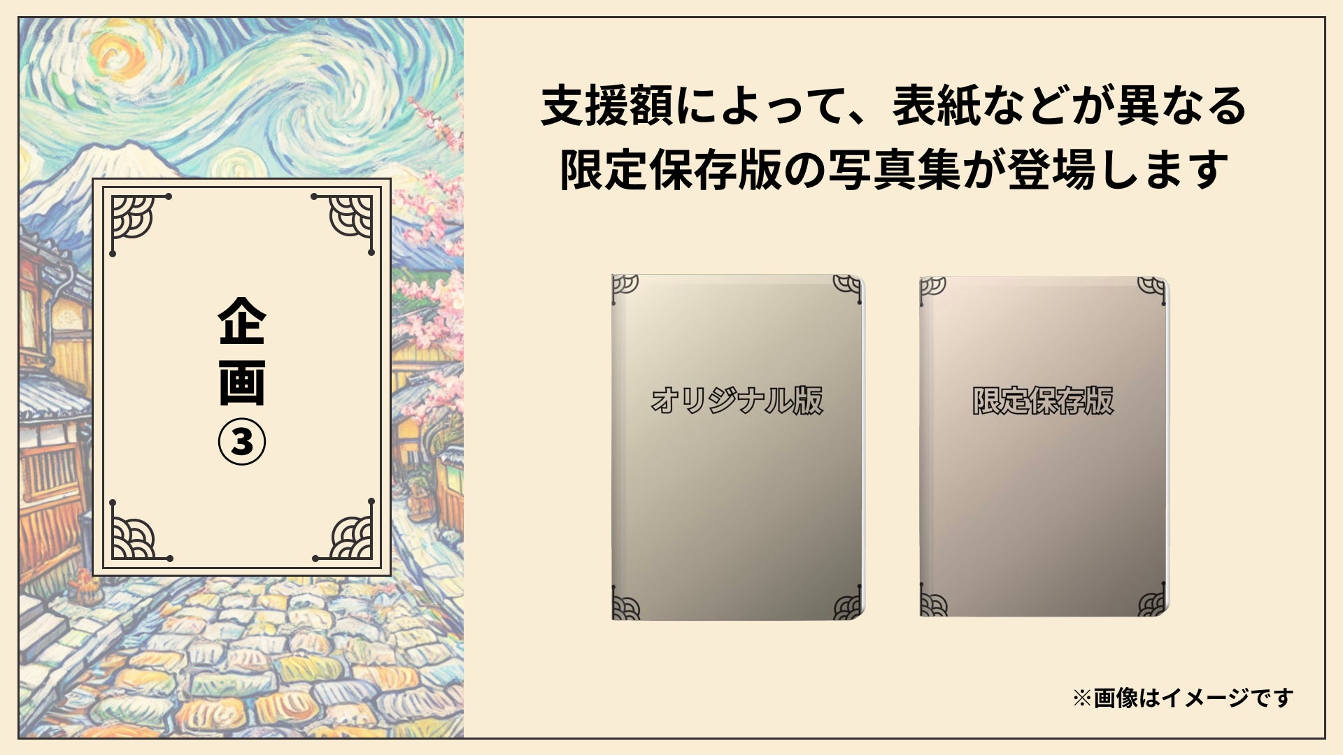 また、目標金額を突破した際にはオリジナル版から変更を加えた「限定保存版」を購入できるリターンの追加や、「生写真」のプレゼントなど楽しんでいただけるリターンを検討中です