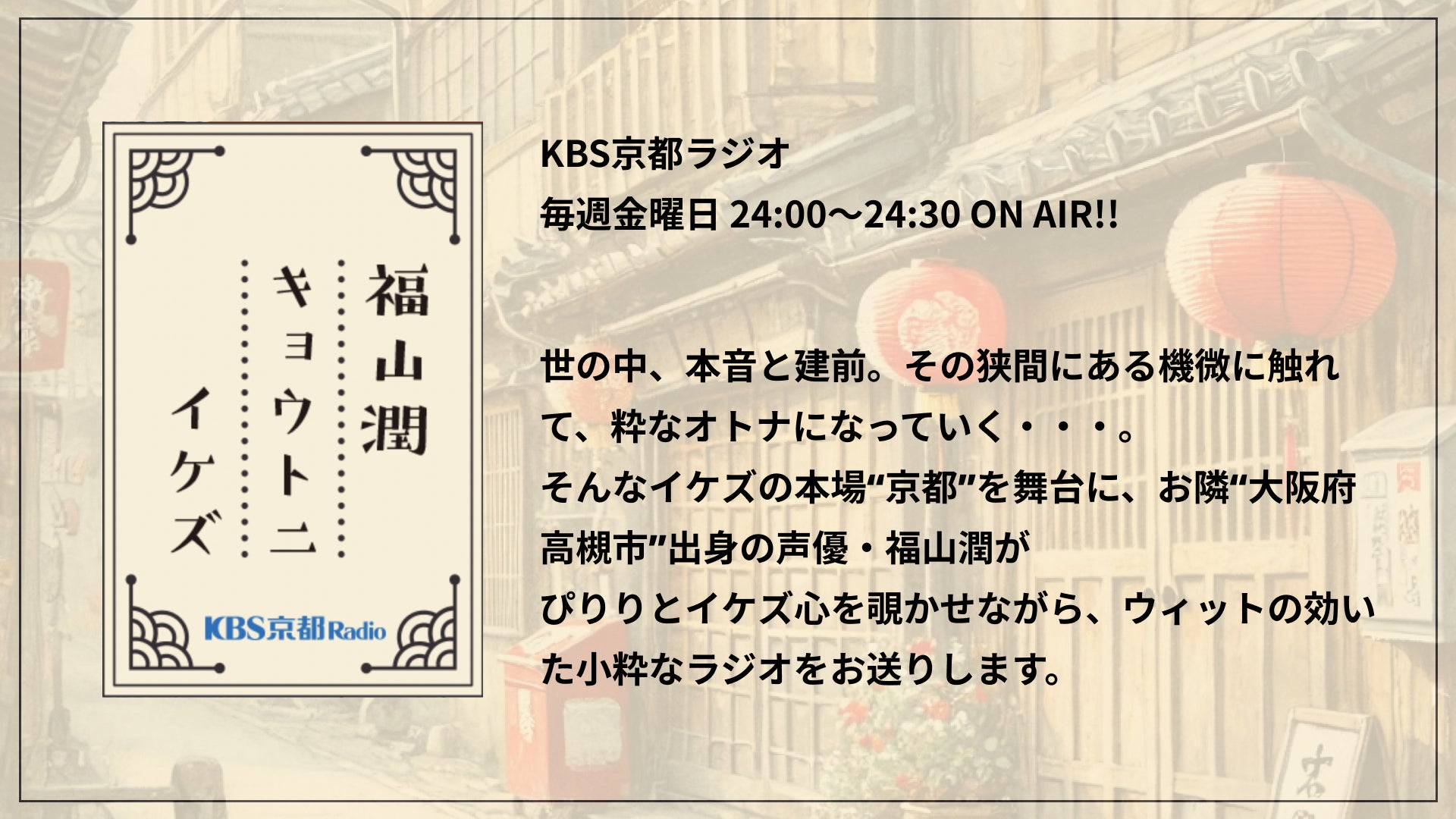 私たちは、京都府を拠点にラジオ・テレビの放送を行っております。ラジオは1951年に開局し、今年で73年周年を迎えます。KBS京都ラジオの長い歴史の中で数々の名物番組が誕生してきましたが、いま人気を集めているのが声優・福山潤さんがパーソナリティを務める「福山潤 キョウトニイケズ」です。