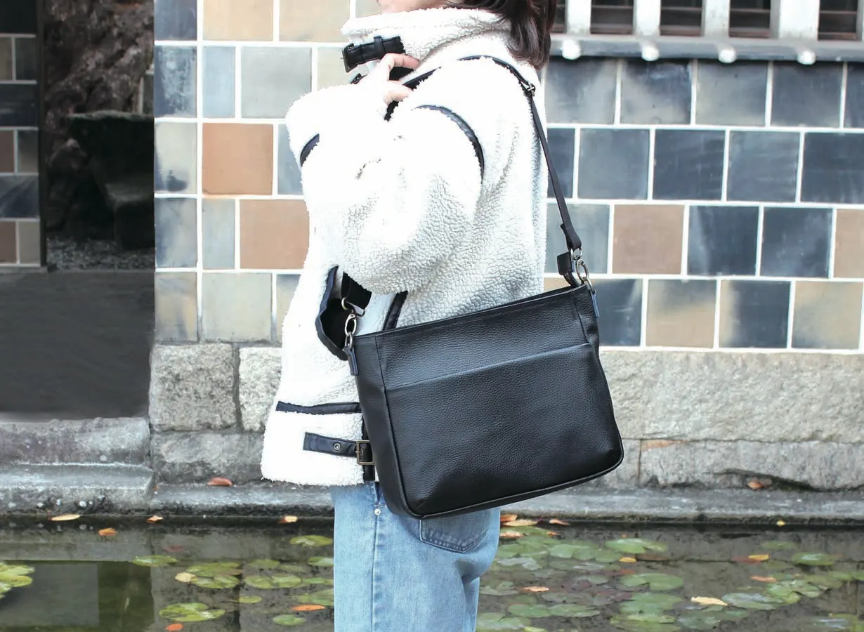 しっかりとしたシックなかばんなのでカジュアルなアイテムでアレンジしても