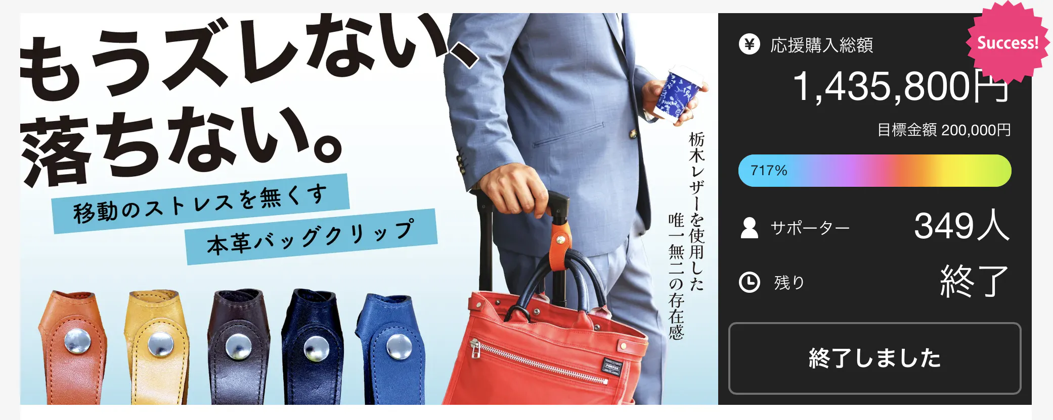 そんな栃木レザーバッグクリップは、初めてのクラファンでなんと349人の方からご支援をいただき、目標金額を717%達成しました!