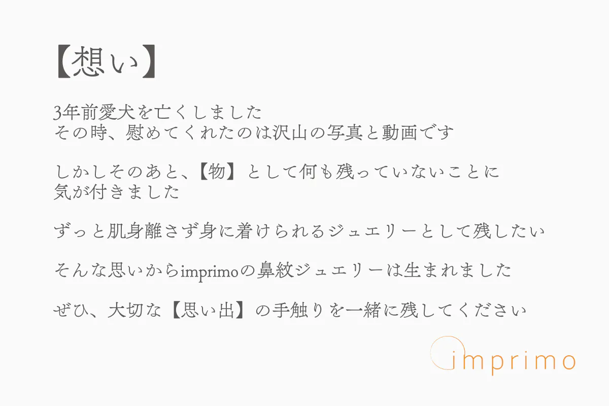 2025/04/12 11:00【クラウドファンディング返礼品発送完了&オンラインストアオープンのお知らせ】ご支援いただいた皆さまへこのたび、クラウドファンディングの返礼品の発送がすべて完了いたしました!まもなくお手元にキットが届きますので楽しみにお待ちください♪また、「クラウドファンディングをもう一度実施してほしい!」というお声をいただけて、とても嬉しく思っています。そんな皆さまのお声にお応えして、クラウドファンディングではありませんが…imprimo公式オンラインストアがオープンしました!【オンラインストア限定の新商品も登場!】ストアのオープンに合わせて、✔ Sサイズセット✔ ピアスタイプのジュエリーが新しく仲間入りしました!より身近に、より自由に、大切なペットとの思い出を形にできるラインナップを取り揃えています。【SNSでのシェアをぜひお願いします!】キットが届いたら、紋を採る様子や完成したジュエリーの写真など、ぜひSNSでシェアしてください!あなたとペットだけの特別なストーリーを、「#imprimo」「#鼻紋ジュエリー」のハッシュタグをつけて投稿していただけると、とても励みになります。【これからも新商品が続々登場予定】imprimoでは、今後も皆さまとペットの絆を形にする新しいアイテムを続々と発表していきます。クラウドファンディングでつながったご縁を大切に、引き続き心を込めて商品づくりに取り組んでまいります。ぜひ、オンラインストアでのお買い物もお楽しみください!▶ オンラインストアはこちらこれからもimprimoをよろしくお願いいたします! もっと見る