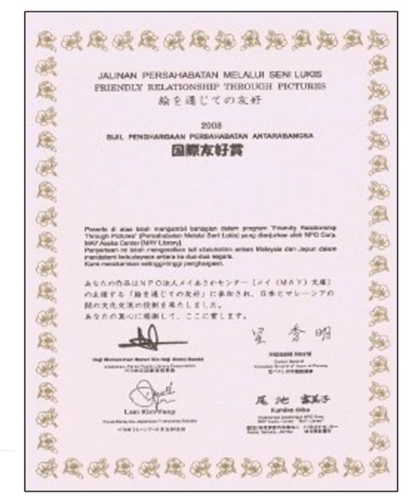 国際友好賞状は、これまでの賞状で一番うれしいから、大事にしよう!絵は、戻って来ないけど、写真をいただくから賞状と一緒に大切にしよう。僕の絵を、マレーシアまで見に行きたい。