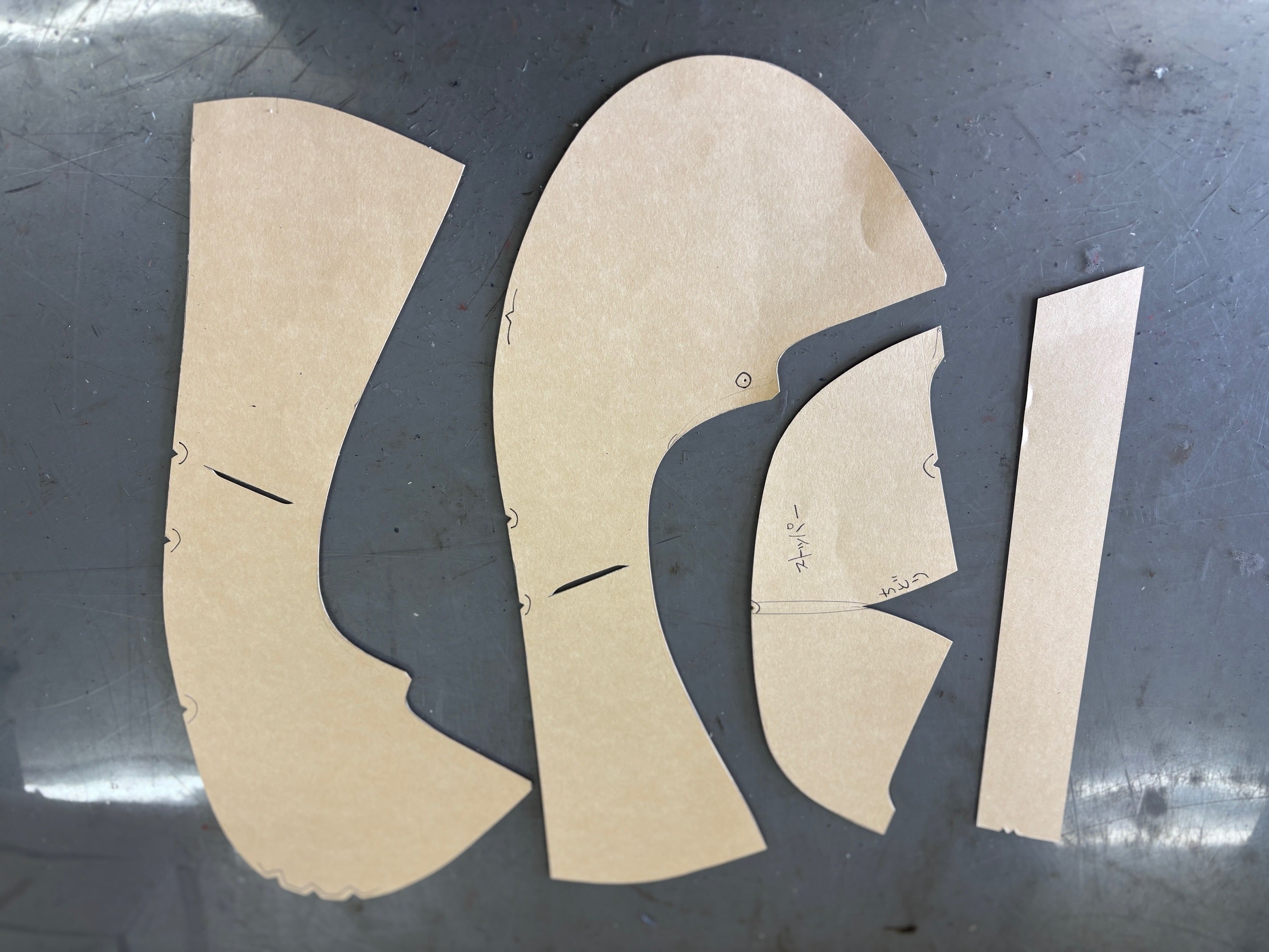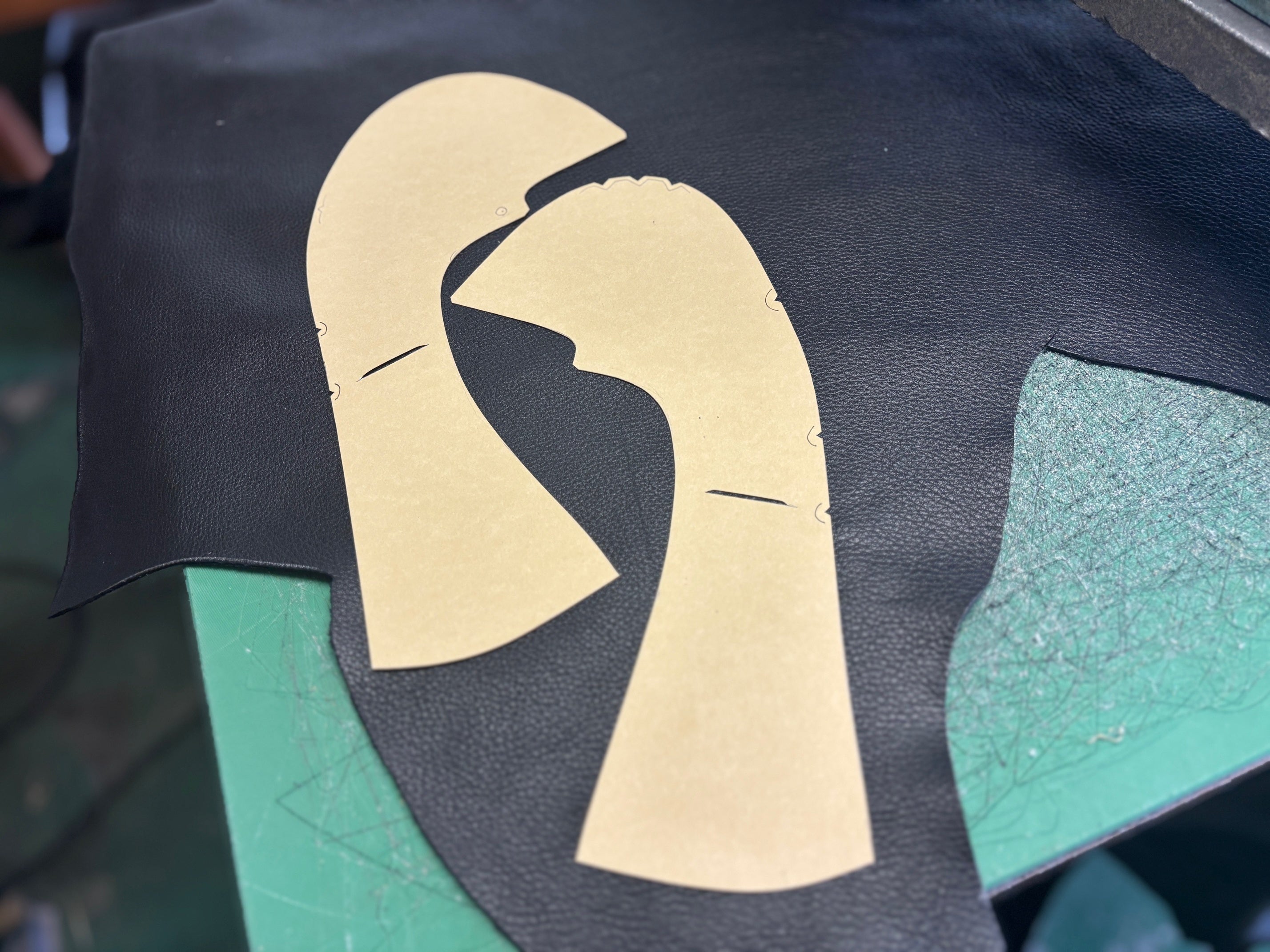 本来は、裁断機で裁断しますが、今回はまだ生産用の裁断型がないので、アッパー部分は弊社契約デザイナー様に作っていただいた紙型を使って手作業で裁断します。
