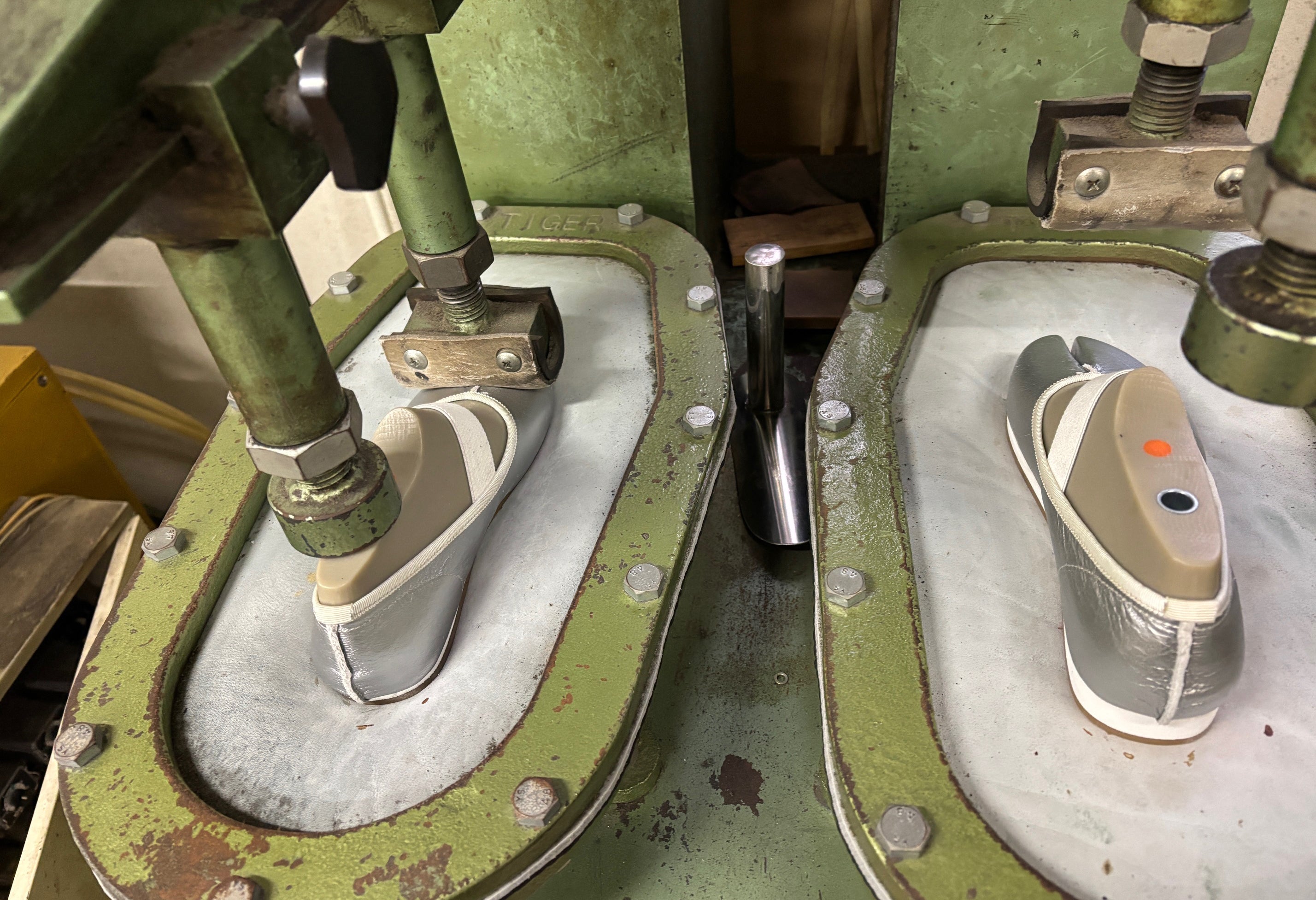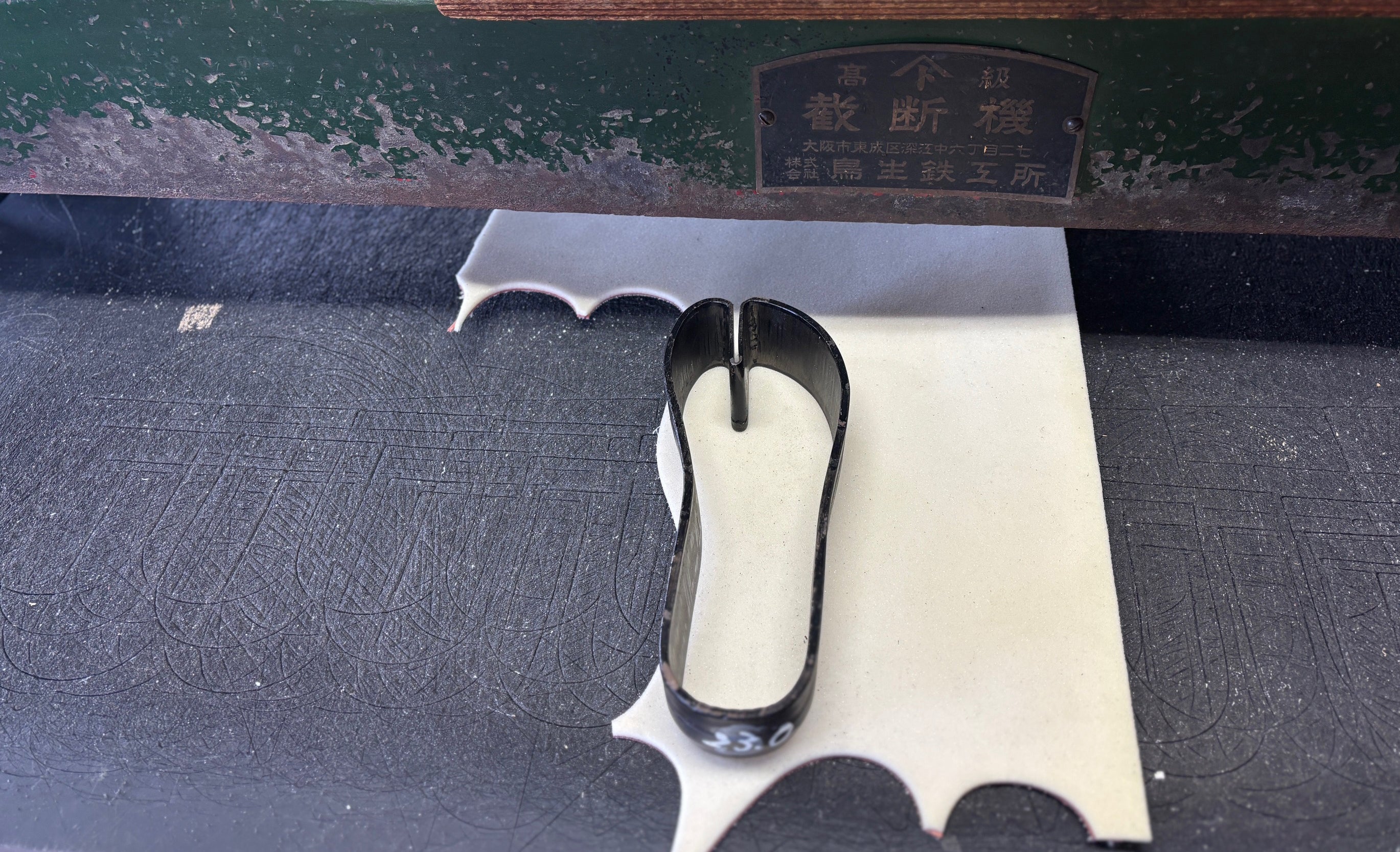 インソール材の裁断(クリッカー裁断機)【縫製工程】