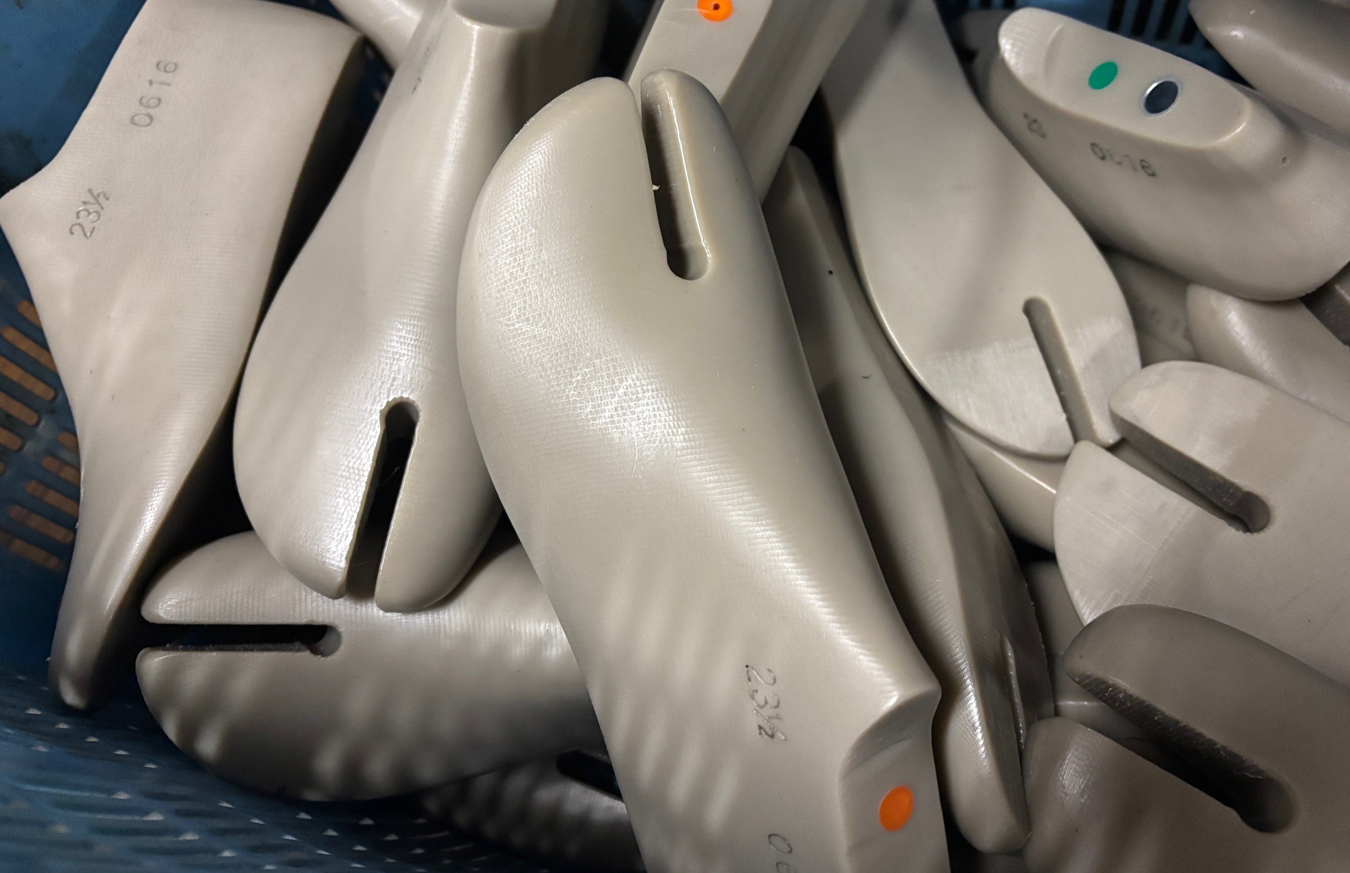 ラストを使って、縫製して形作ったあっぱ部分を靴の形に仕上げます。