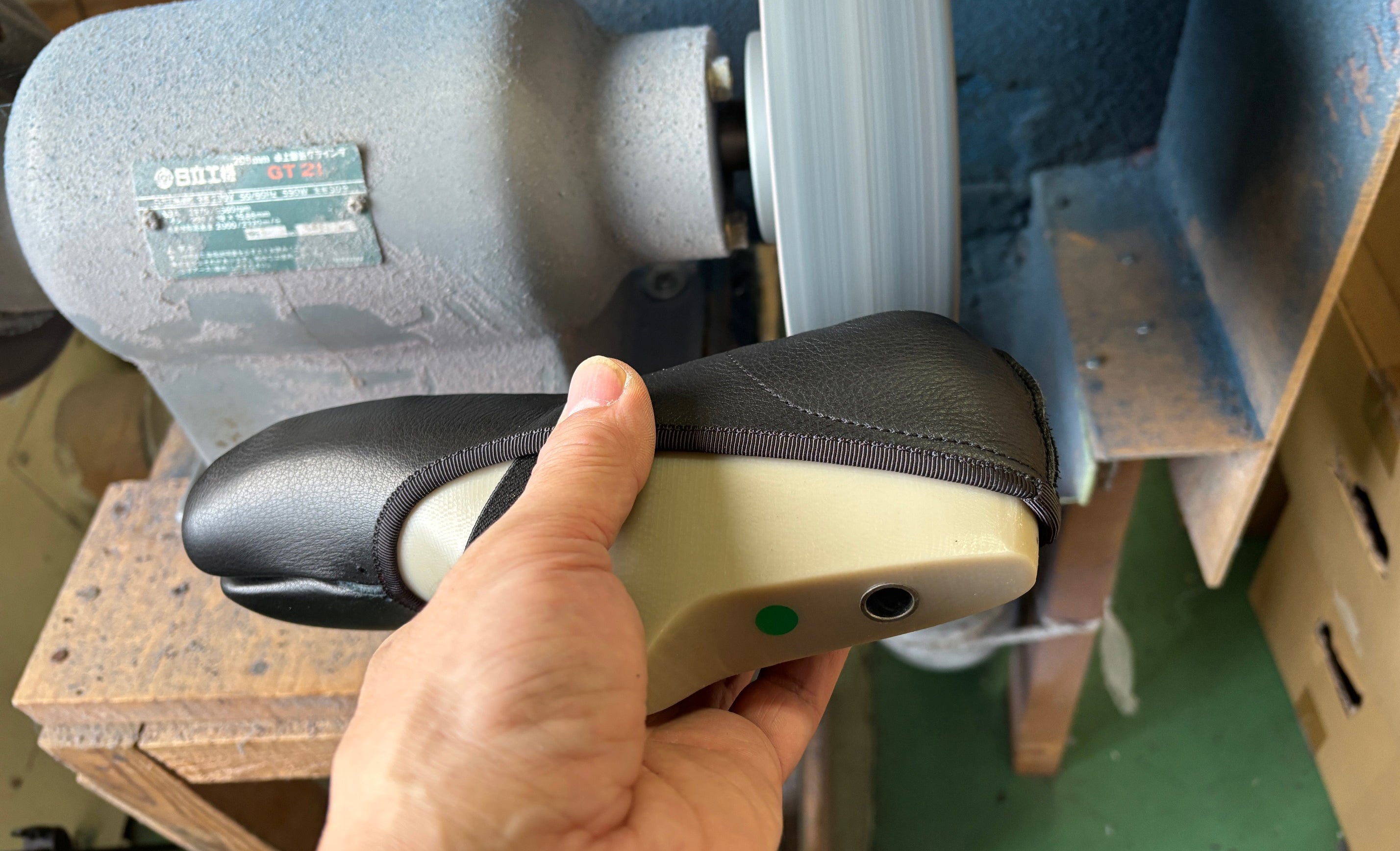 吊り込んだ後、皮革の表面は接着剤がきかないので、バフかけします。