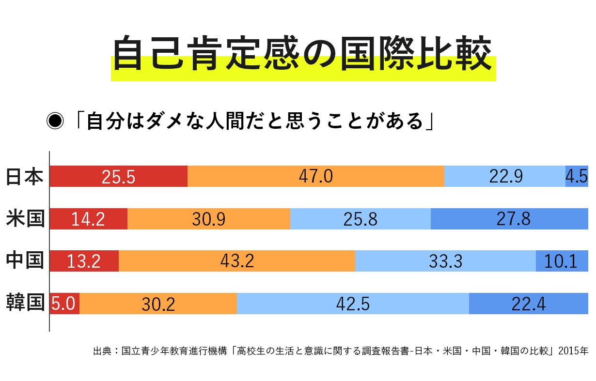 皆さんはこのデータをご存知でしょうか?実は、日本の若者の自己肯定感が、世界的にとっても低いという悲しい現実があるんです。