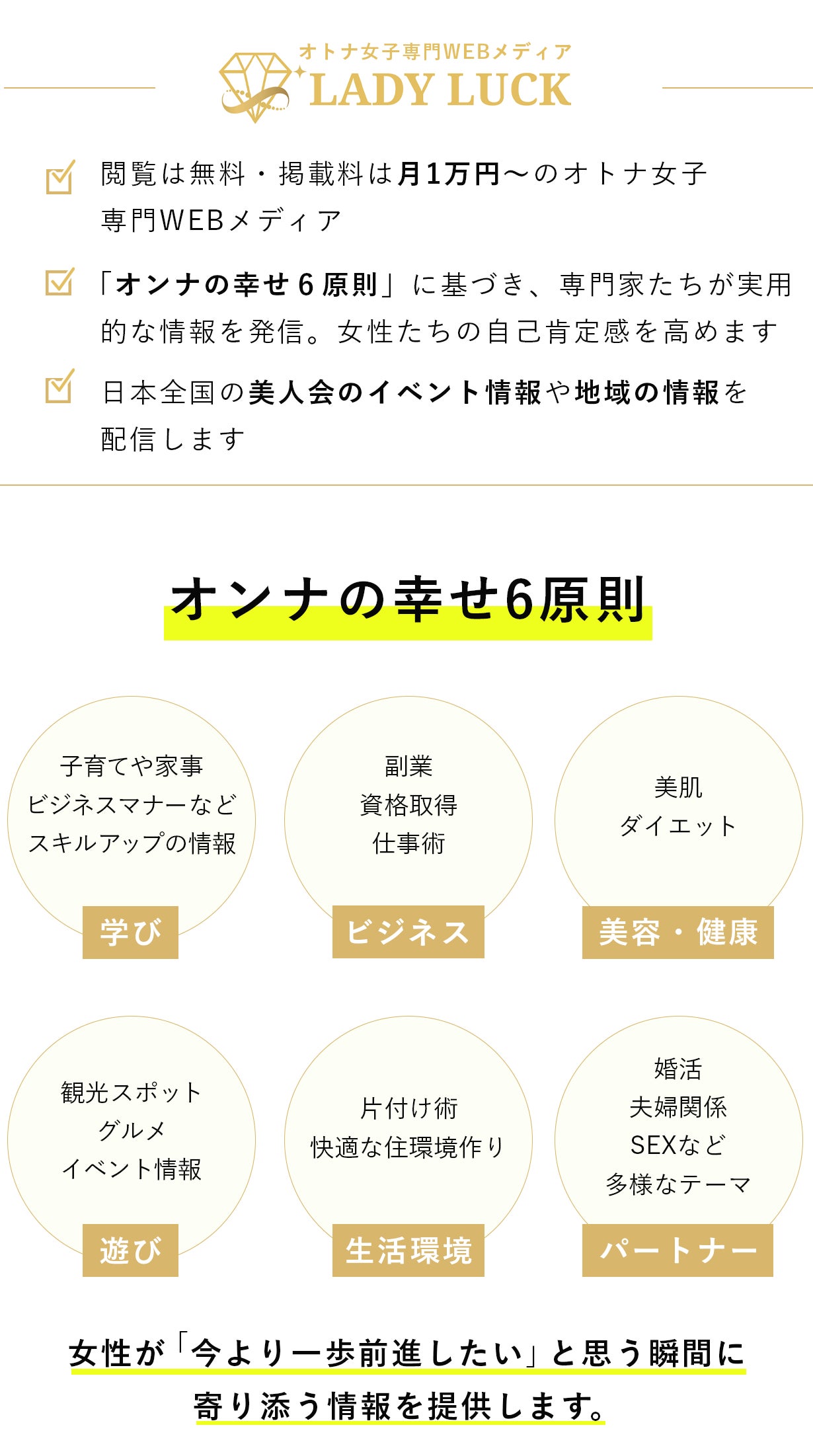 その具体的な手段として、オトナ女子専門WEBメディア「LADY LUCK」を立ち上げる決意をしました。