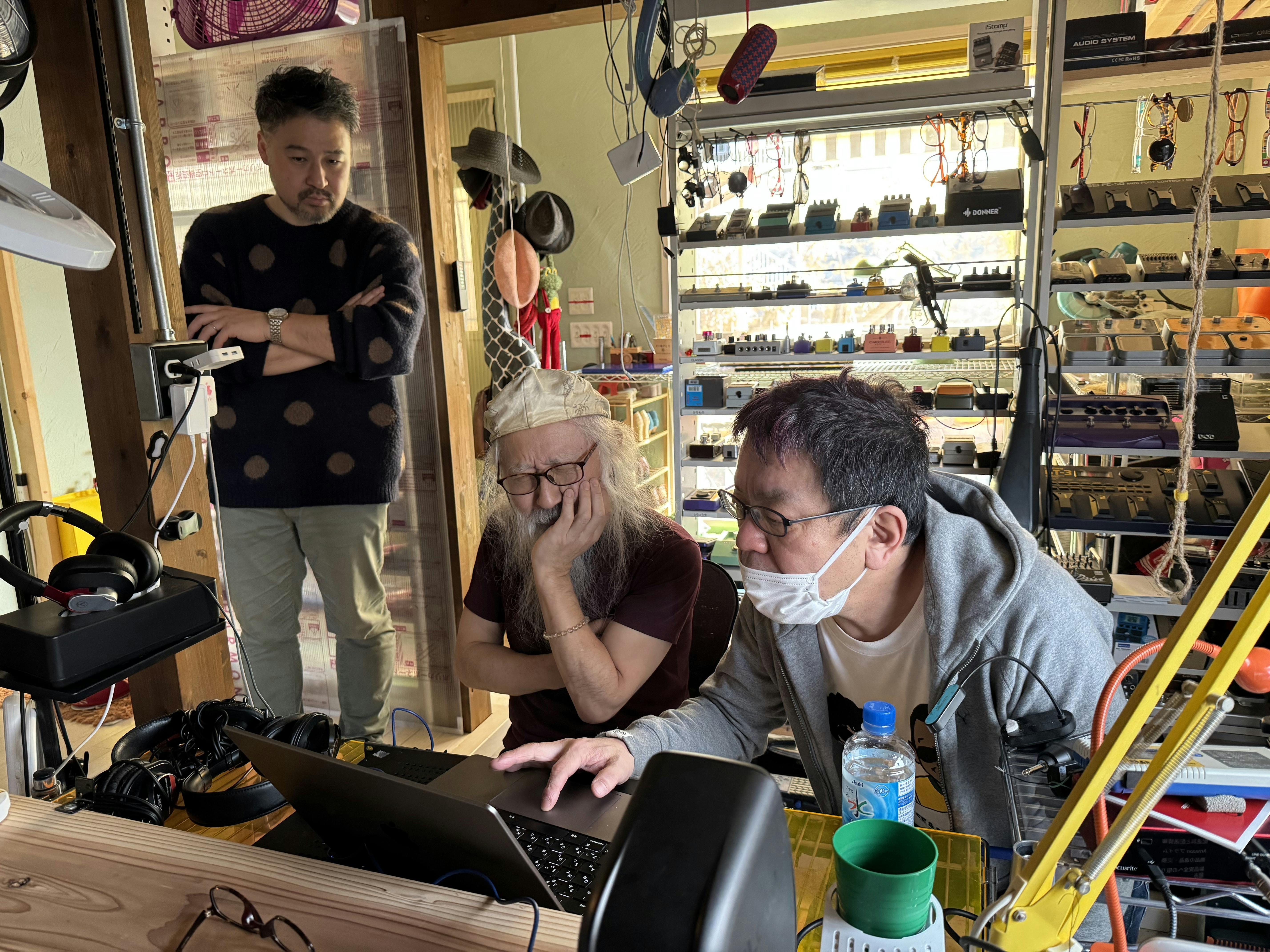 2025年2月10日はクラキスイレブンの事務所でMAMBO INNのリーダースティーブ・サックスさんと、翌11日はゆううん三銃士のリーダー中西俊博さんのご自宅で最終的な音のバランス調整を行いました。今までも少しずつ音を整える作業は行ってきましたが、今回は実際に関係者全員が集まって何度もテストして聴きなおし、納得のいくバランスになるまで細かく調整していきました。