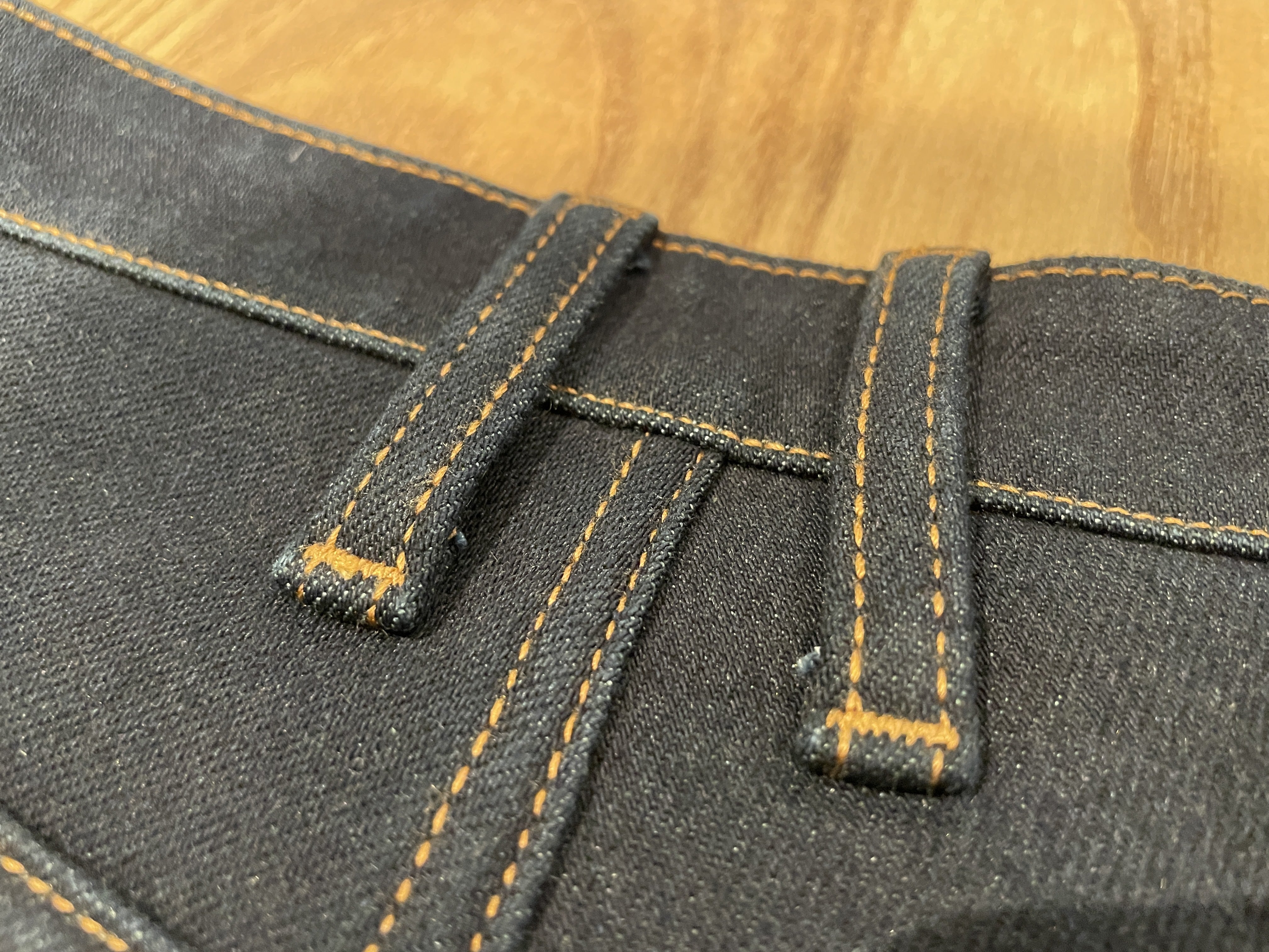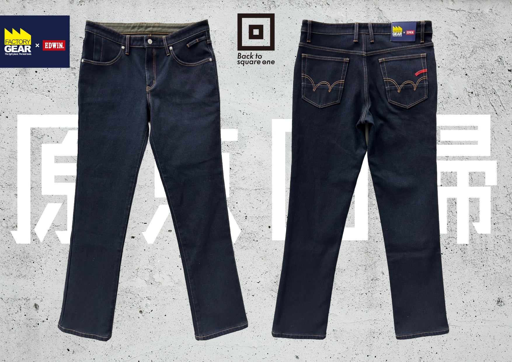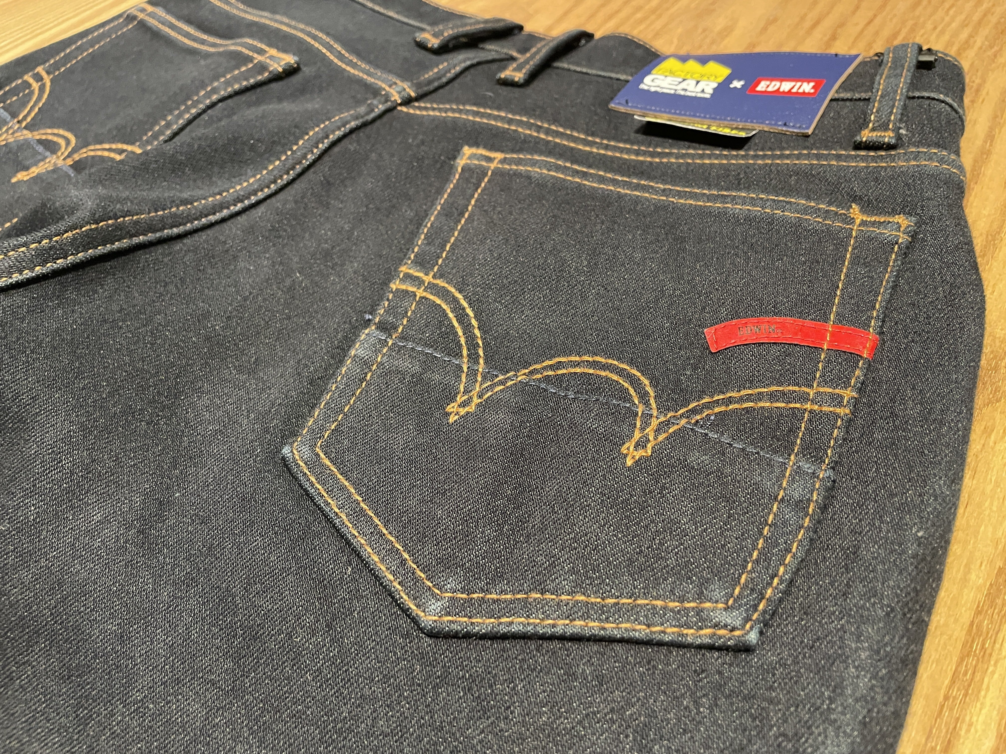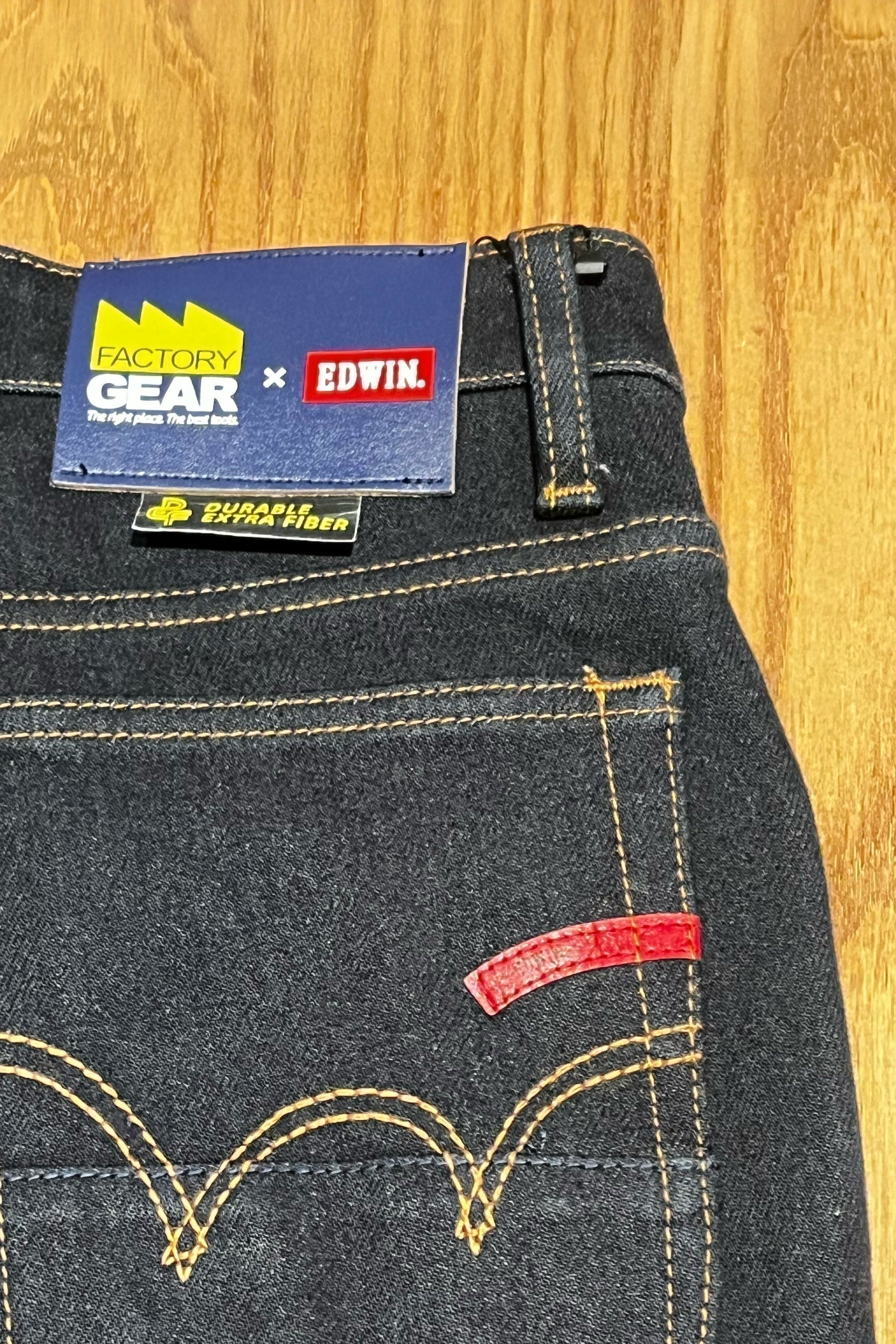 1.生地はEDWIN史上最強強度を誇るDEFデニムを採用(EDWINが商標出願中) 耐摩耗性(綿100%デニム比較 2倍) 引っ張り強度(綿100%デニムは400ニュートン、DEFデニム=700ニュートン) 引き裂き強度(縦糸・横糸、どちらも綿100%デニム以上、測定限界値64.0ニュートンを超える。*一般は10.0ニュートン) 履いた際、人体との抵抗値を減らすスムースな裏地をボンディング。滑りを良くした事で、履き易く、動き易い機能を持っています。また、強度を上げた副産物としてシワや型崩れが殆ど発生しない生地となっております。