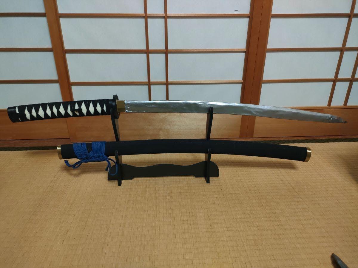柄、鞘、鍔はABS製、はばき、切羽、目貫はPLA製です。家庭用の3Dプリンターは、最大でも26 cm程度の小さなものしか印刷できないため、鞘は3等分した部品を接着しています。