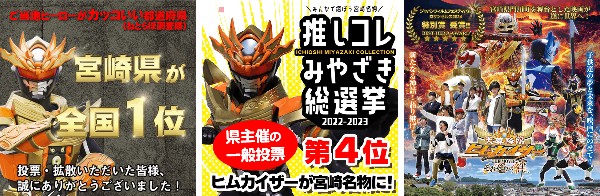 宮崎で生まれたご当地ヒーロー「ヒムカイザー」。2021年には、第1回ご当地ヒーロー人気投票の全国1位にも選ばれました。2023年には、宮崎県が主催する宮崎名物県民投票で「チキン南蛮」「サーフィン」「宮崎牛」に次ぐ第4位に。さらに、ご当地ヒーローとしては前代未聞だった映画化に挑戦。2023年8月に、映画「天尊降臨ヒムカイザーTHE MOVIE」として公開しました。そして、その映画は、2024年に米国ロサンゼルスで開催された『ジャパン・フィルム・フェスティバル・ロサンゼルス』で特別賞「ベストヒーローアウォード」を受賞しました。