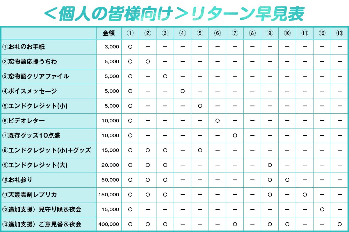 ※高額リターンの中にはグッズリターン等が含まれているものもございます。リターン画像スライド(スマホでは拡大ボタンをタップ)と詳細を必ず確認してご支援ください。