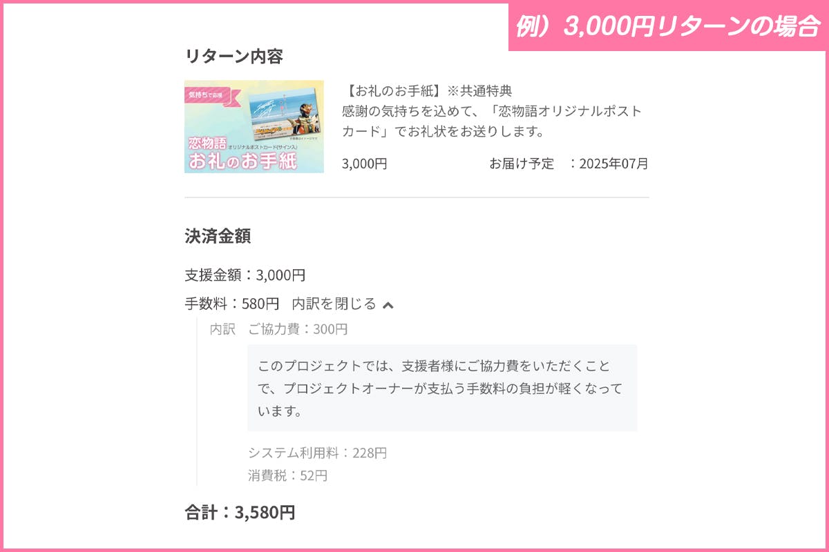 今回のクラウドファンディングはエンタメ応援プランを適用させていただいており、システム料とは別にご協力費として支援者さまに「支援額の10%+消費税」をお支払いいただいております。