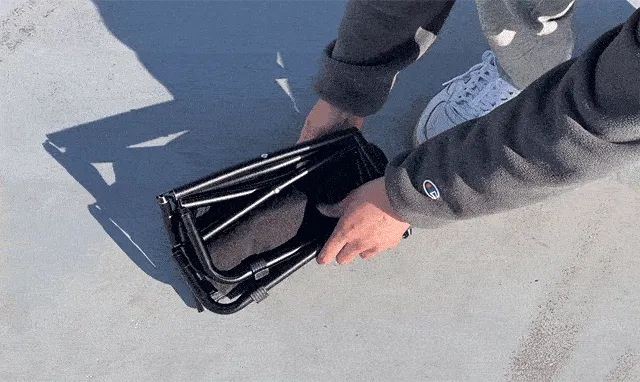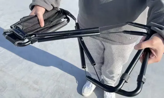 フレームを広げ、全体を180°曲げて展開した後、上下のポールを接続口に取り付け、座席の向きを確認したら、簡単に組み立てることができます。慣れれば、たった10数秒で組み立てが完了します!