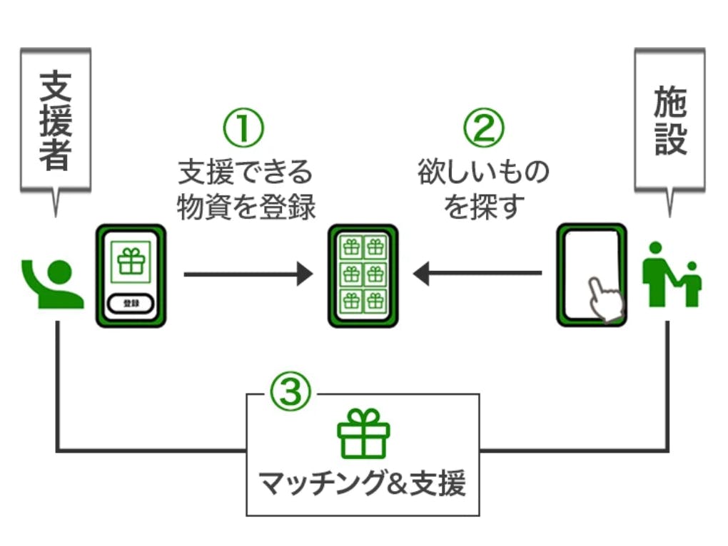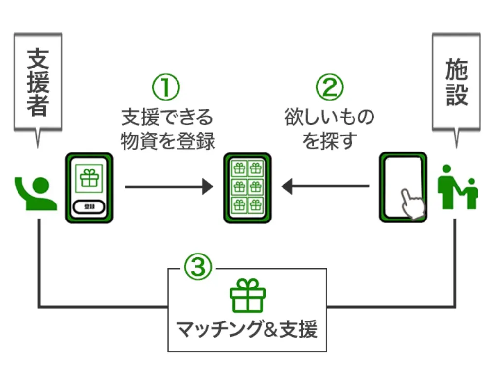 支援する側は、提供する物資をアプリへ登録するだけで、「なにを、どれだけ、どこに送る」といった施設への事前確認を行う必要がなくなります。