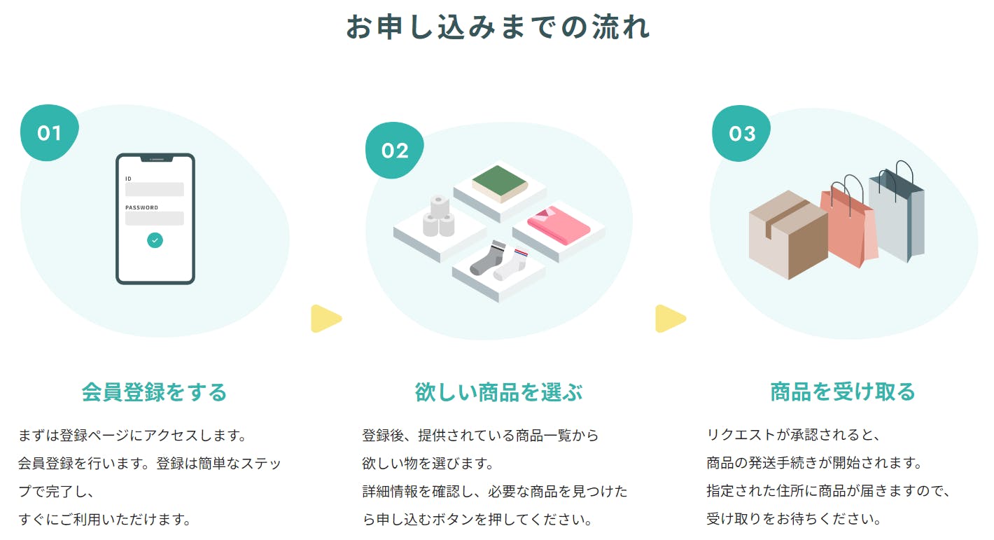 支援者が物資を登録する場合、賞味期限が長いものや、新品・新古品など、長期間使えるものであれば一品からでも登録可能です。