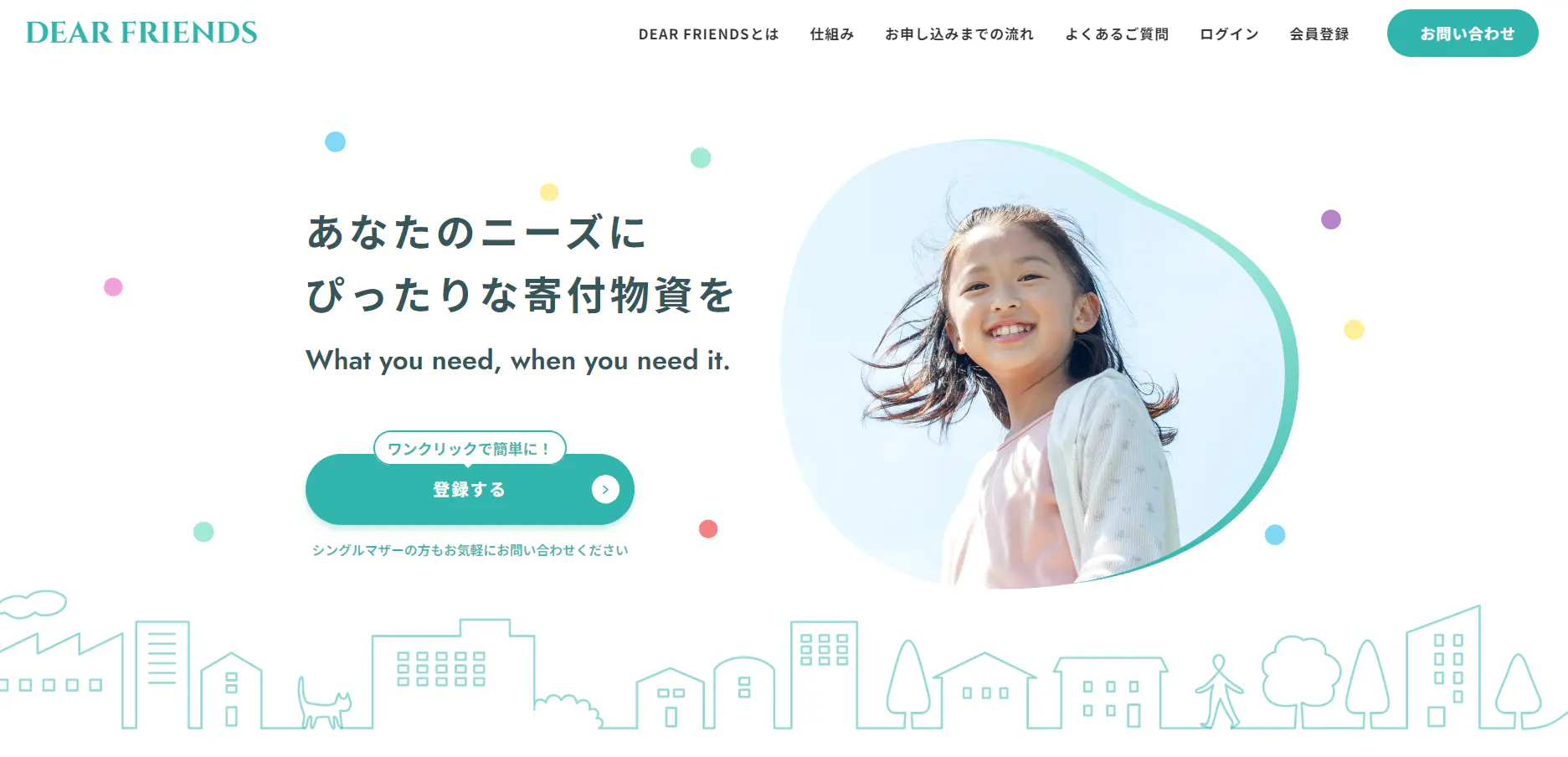 DEAR FRIENDSとは、物資を必要とする児童養護施設と、支援をしたい個人や企業を結ぶためのマッチングサイトです。2024年10月よりサービスを開始しました。