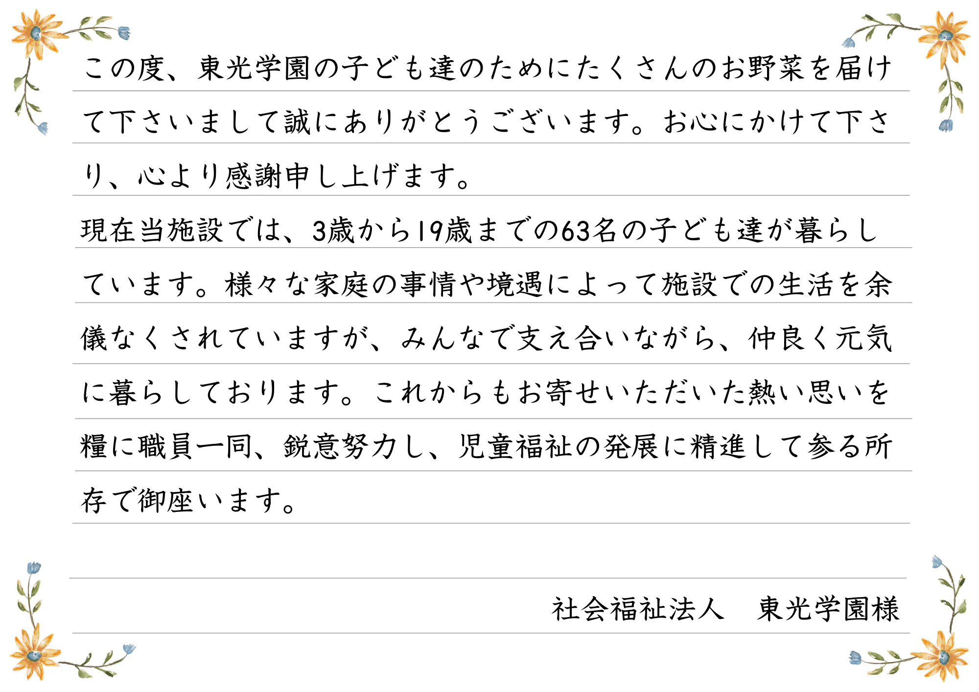 個人情報の関係上、現地の子どもたちの様子を写真でお伝えすることはできませんが、前々回のプロジェクトで各支援先からいただいた手紙やメッセージの一例を、ご紹介いたします。