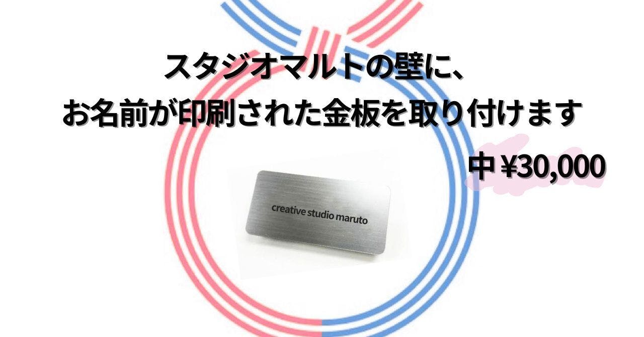 スタジオマルトの壁に、個人名、会社名、団体名、屋号、お子様の名前など…を印刷した金板を、遊びに来た方や、利用して頂いた方の目に触れる場所に、取り付けさせて頂きます。3月末設置予定です。購入時、備考欄にご希望のお名前のご記入をお願い致します。