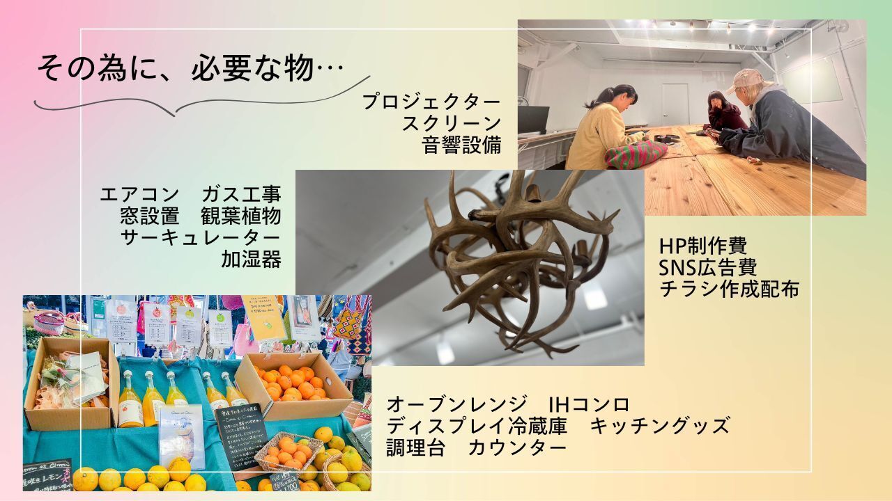 快適な空間環境整備、マルシェ運営費、イベント運営設備、広告費…多岐にわたります!