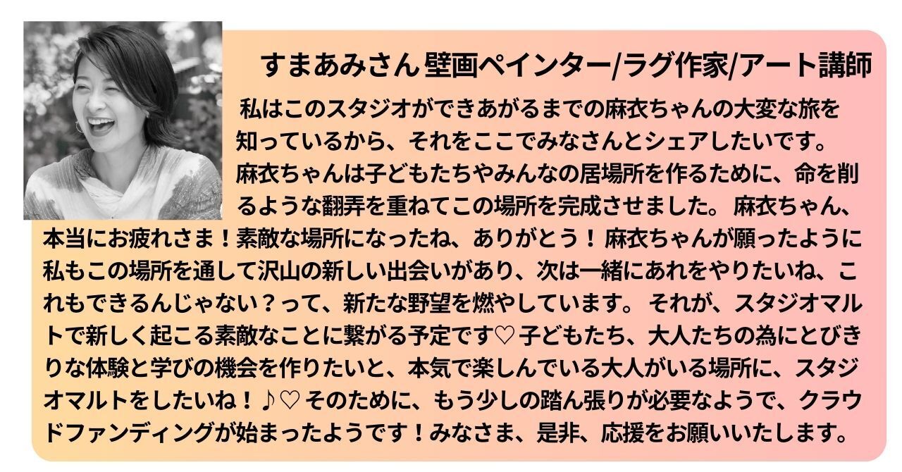 creative studio maruto(クリエイティブスタジオ マルト)のmarutoto!!(マルトと)の実現のため、ご支援のほどよろしくお願い致します!
